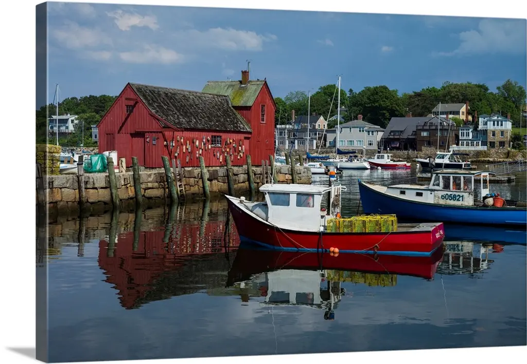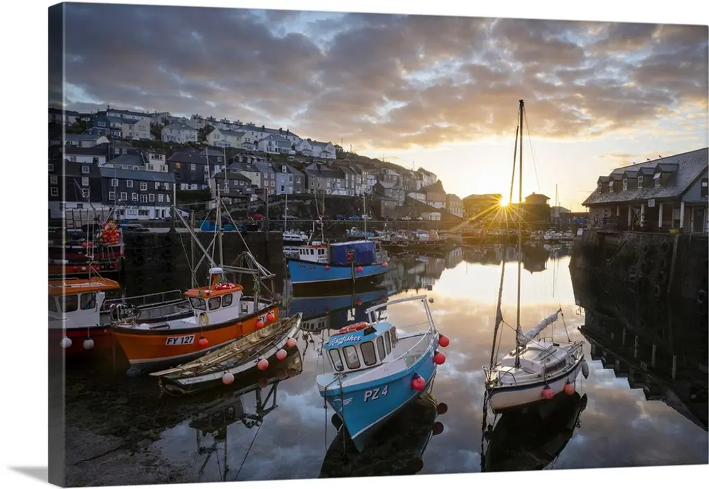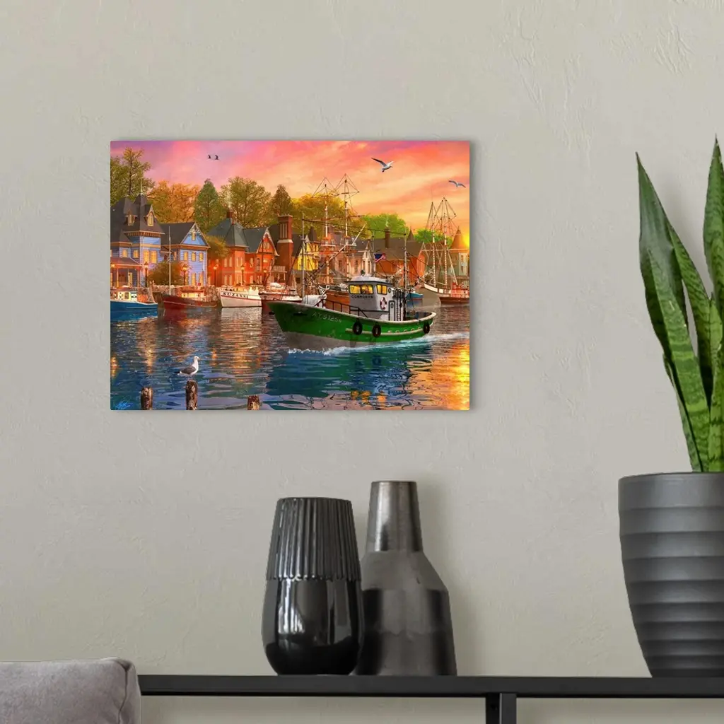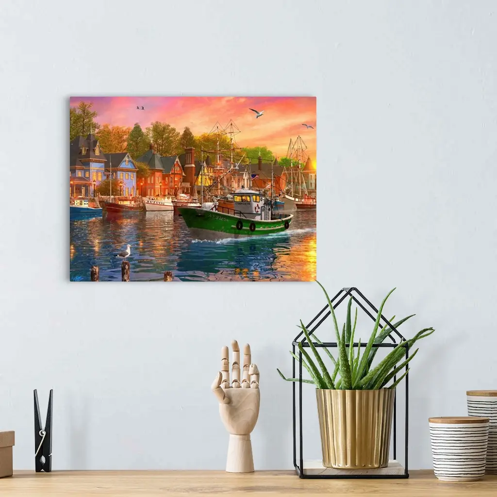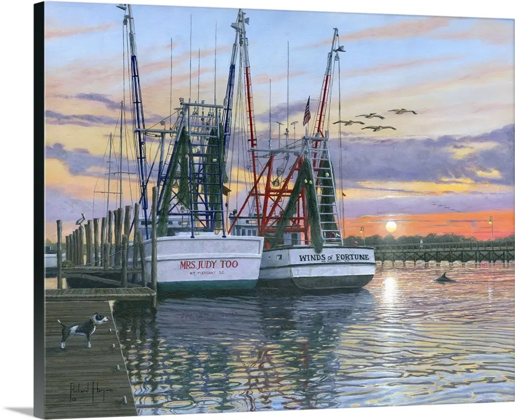 Illustration of a fishing trawler arriving in the harbor at sunset.
