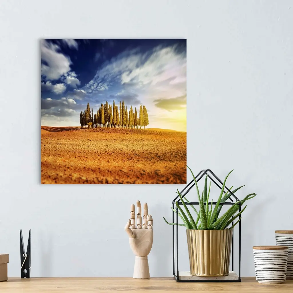 Sunset in a golden field with a row of cypress trees, Italy, Tuscany.