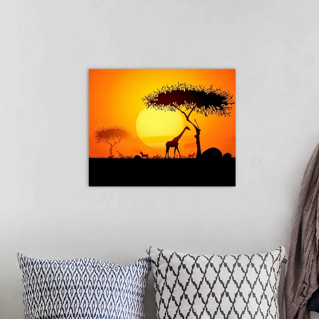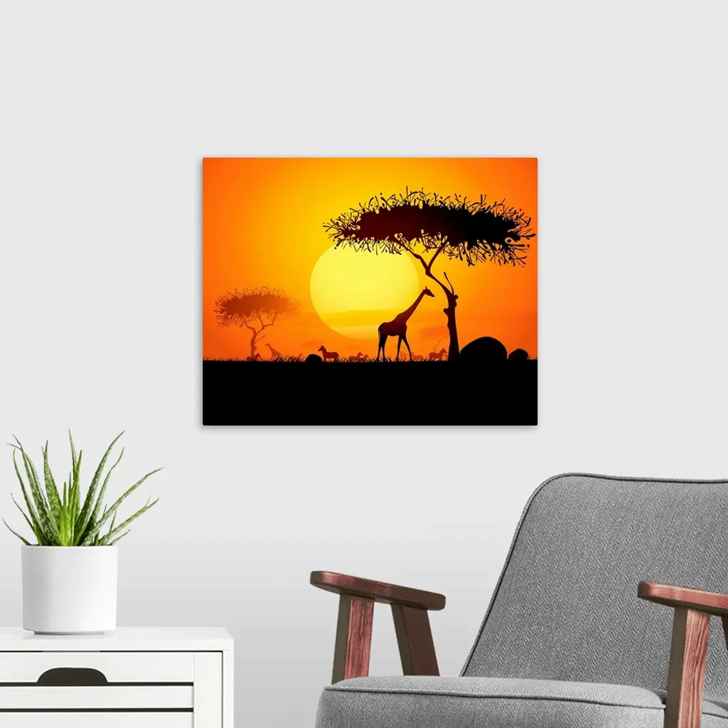 Tranquil sunset scene in africa. Silhouette animals and trees in africa sunset background.