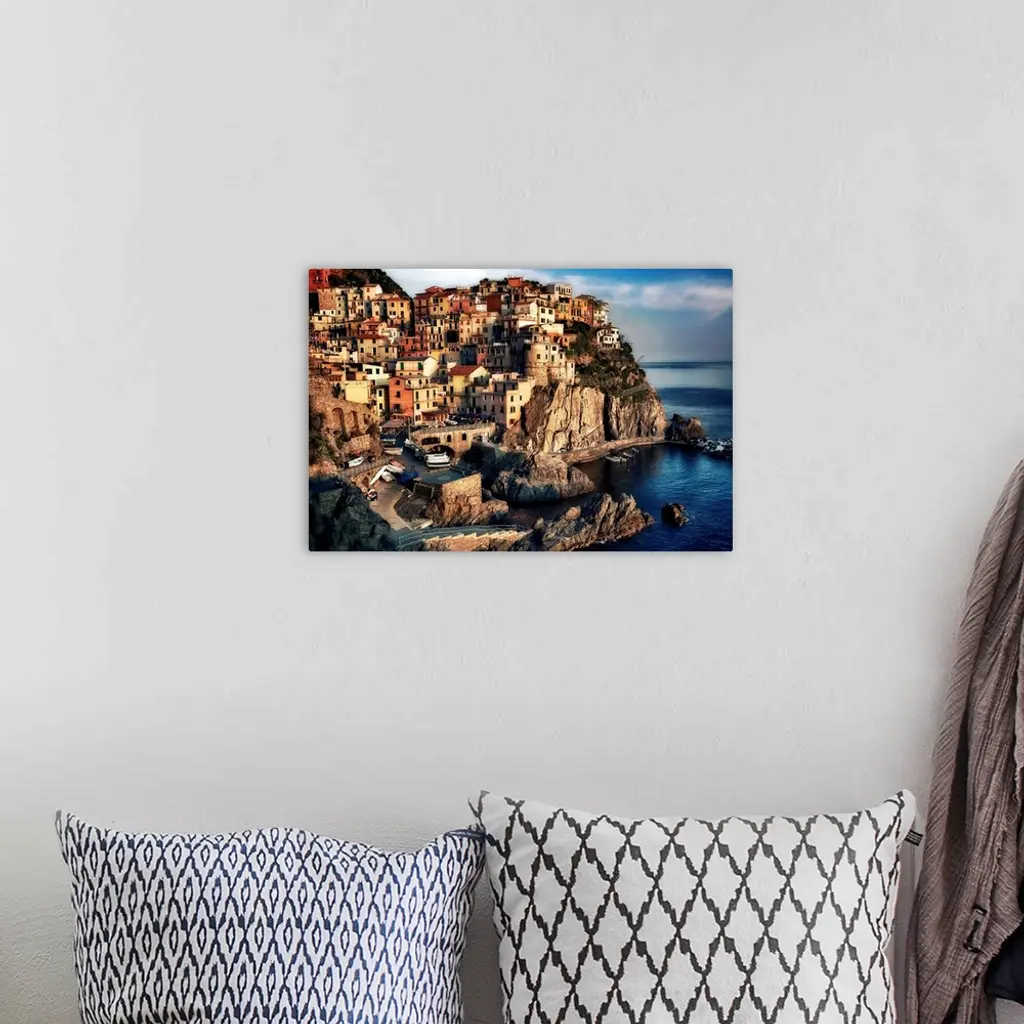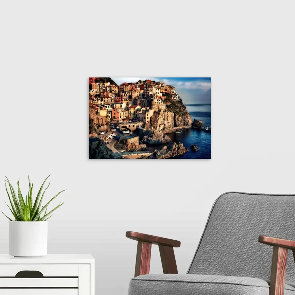 A small town sits in and on a cliff right near the water. The sun has begin to set shining brightly onto the houses.