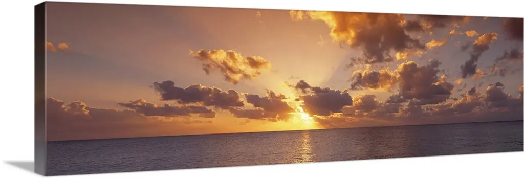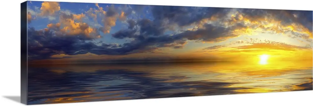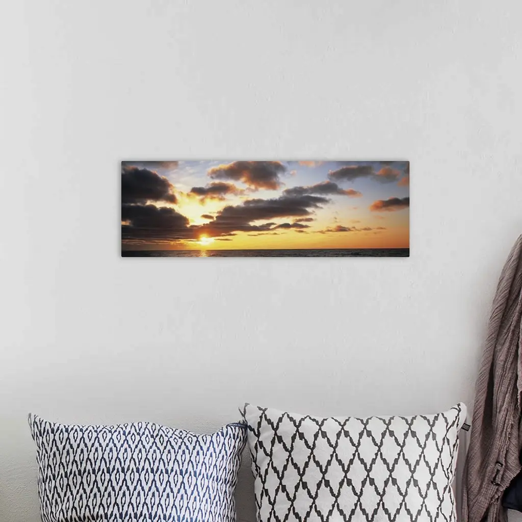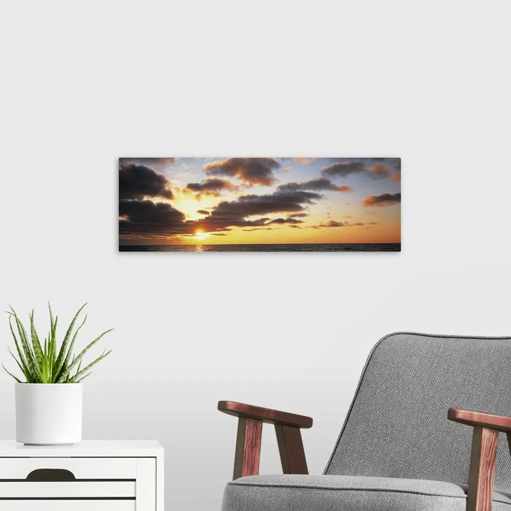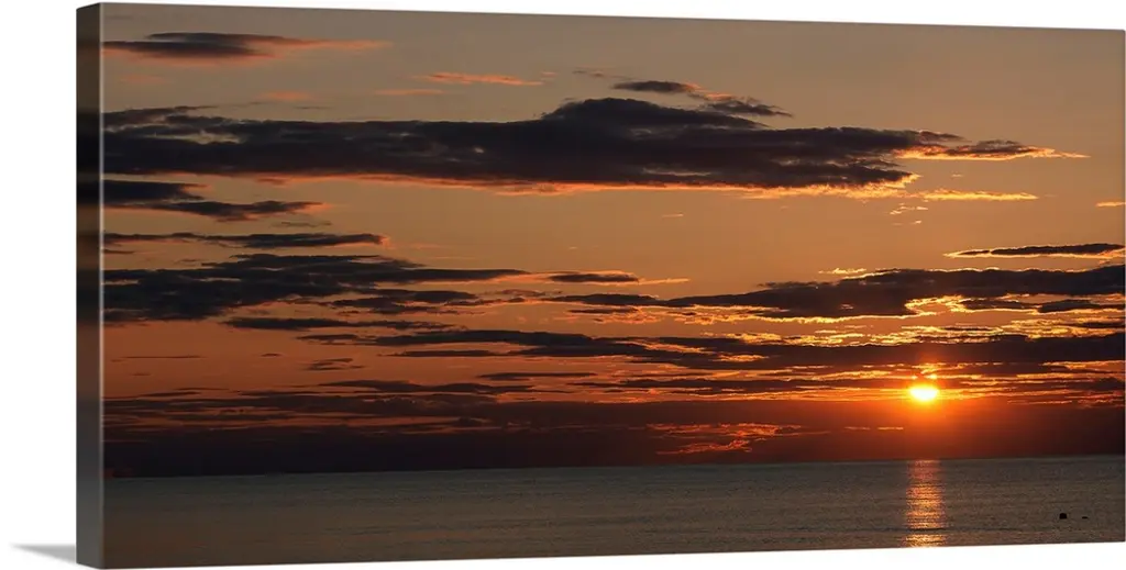 Wide angle photograph of the sun setting slightly behind clouds, over the vast waters of Lake Michigan.