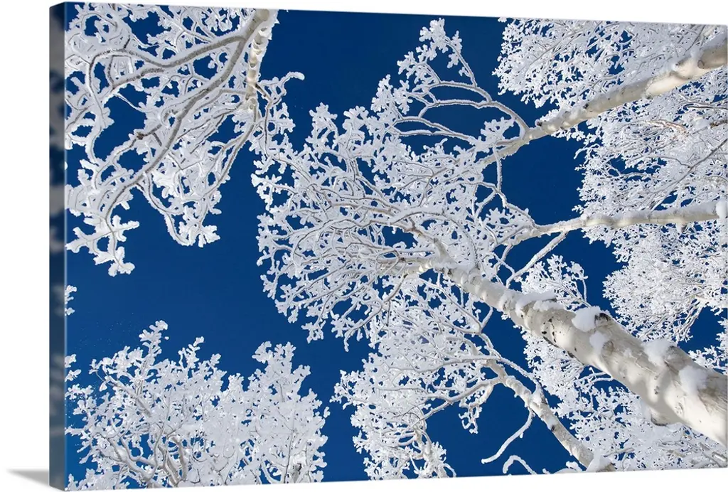Photograph taken from the ground and looking up at birch trees that are illuminated by the sunset behind them.