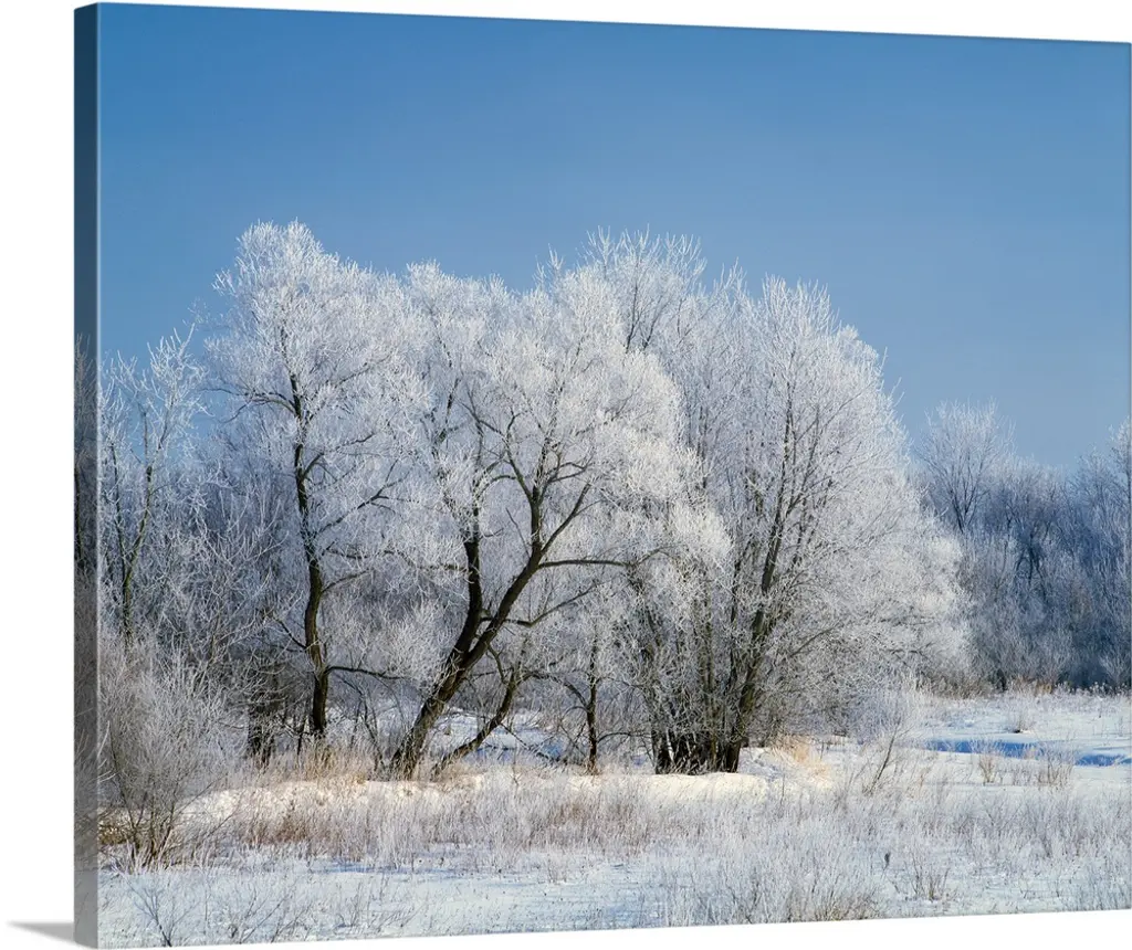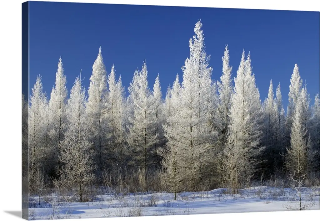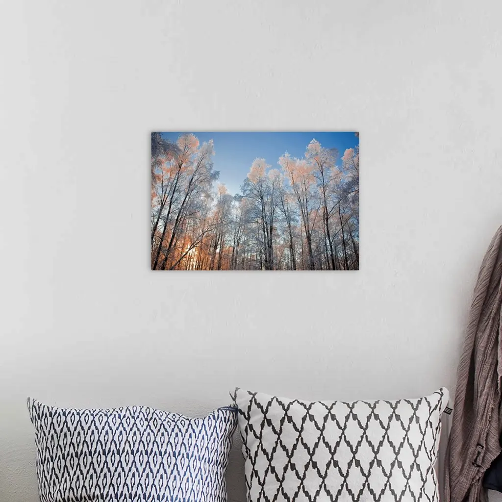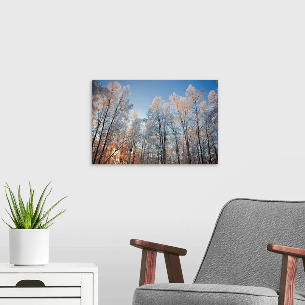 Sunset Light Shining Through Hoarfrost Covered Birch Trees In Russian Jack Park