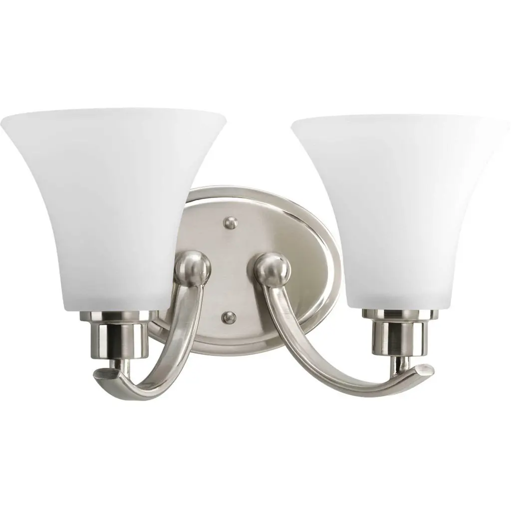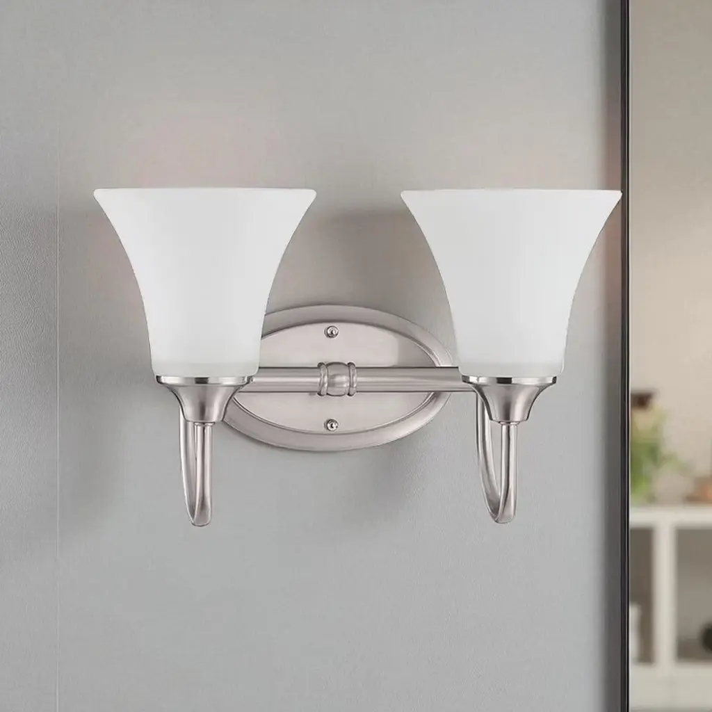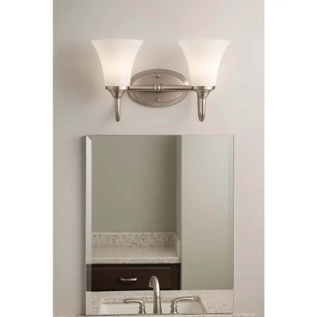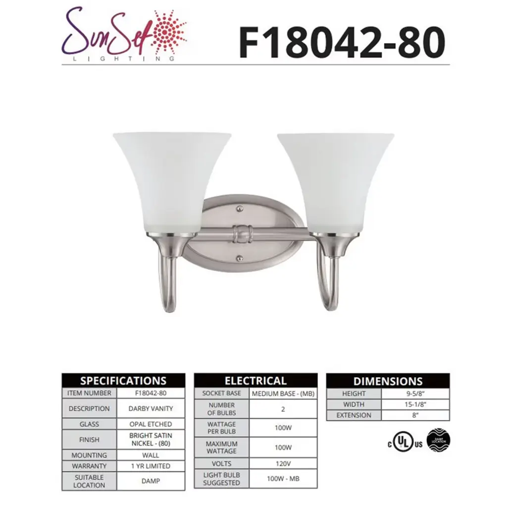 Sunset Lighting 2-Light 100W MB Darby Vanity — Bright Satin Nickel A two-light vanity with opal etched glass and a Bright Satin Nickel finish. Designed for wall mounting and safe for damp locations, it delivers clean, classic illumination over mirrors and sinks using medium-base bulbs. Key Features • Two-light vanity with opal etched glass shades • Bright Satin Nickel (80) finish • Damp rated for bathroom use • Wall-mounted installation • Uses medium-base bulbs for bright, even lighting Specifications ITEM NUMBER: F18042-80 DESCRIPTION: DARBY VANITY GLASS: OPAL ETCHED FINISH: BRIGHT SATIN NICKEL - (80) MOUNTING: WALL SUITABLE LOCATION: DAMP SOCKET BASE: MEDIUM BASE - (MB) NUMBER OF BULBS: 2 WATTAGE PER BULB: 100W MAXIMUM WATTAGE: 100W VOLTS: 120V LIGHT BULB SUGGESTED: 100W - MB HEIGHT: 9-5/8” WIDTH: 15-1/8” EXTENSION: 8”