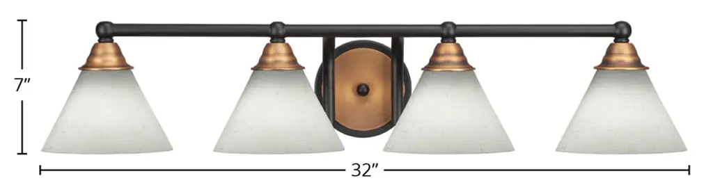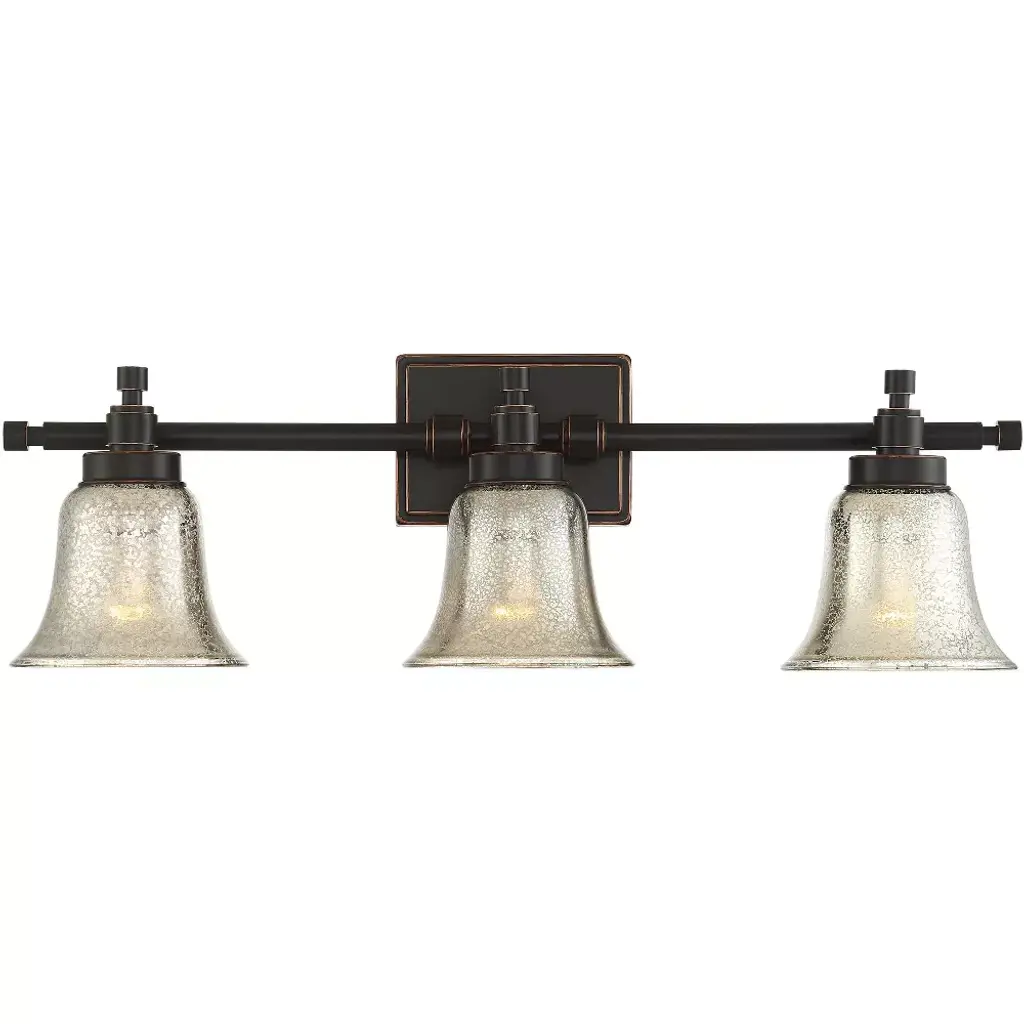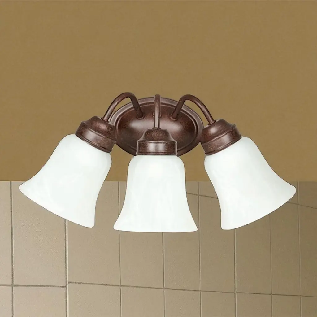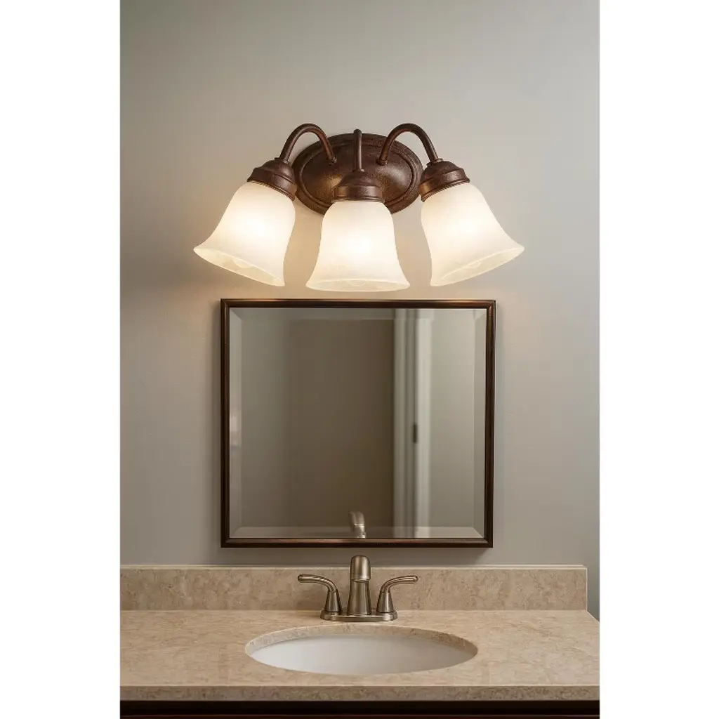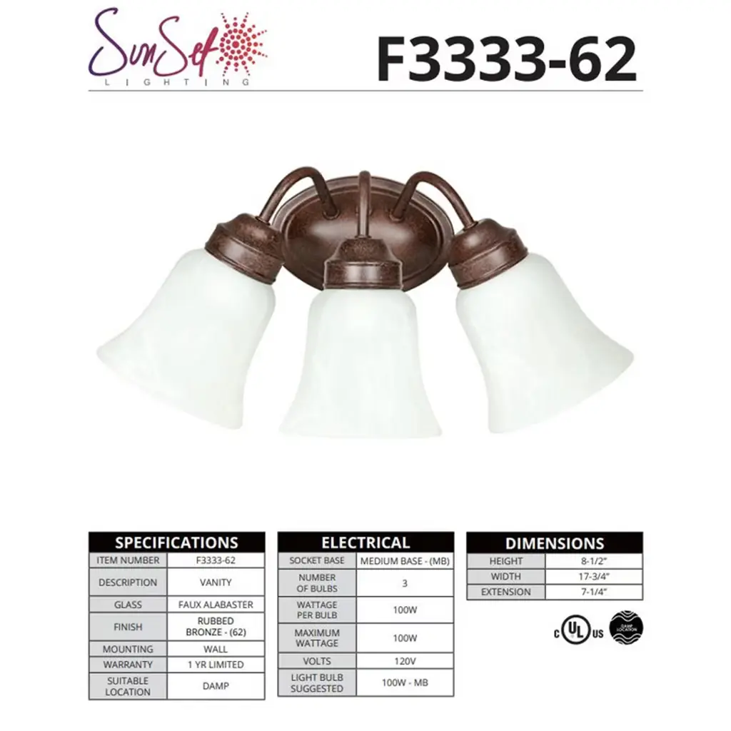 Sunset Lighting Three-Light Bath Vanity, Rubbed Bronze with Faux Alabaster Glass A compact, wall-mounted vanity light featuring a rich Rubbed Bronze finish and faux alabaster glass shades. Damp-rated for bathroom use and designed to provide warm, even illumination over mirrors. Key Features • Three-light vanity fixture for bathrooms • Rubbed Bronze finish pairs with faux alabaster glass • Damp location rated; wall mount installation • Uses medium base bulbs for easy replacement Specifications Item Number: F3333-62 Glass: Faux Alabaster Finish: Rubbed Bronze (62) Mounting: Wall Suitable Location: Damp Socket Base: Medium Base (MB) Number of Bulbs: 3 (not included) Wattage per Bulb: 100W Maximum Wattage: 100W Voltage: 120V Light Bulb Suggested: 100W – MB Height: 8-1/2” Width: 17-3/4” Extension: 7-1/4”