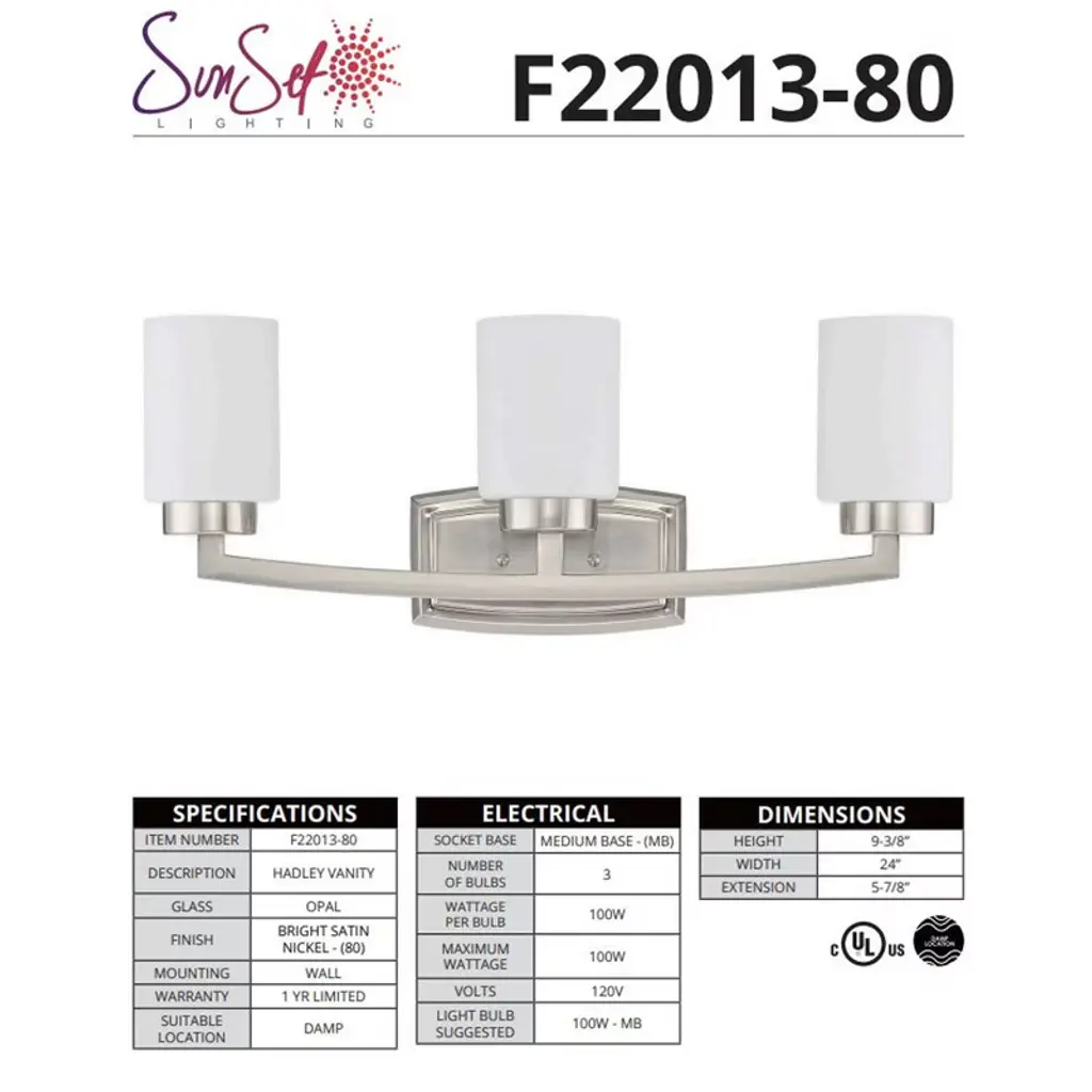 Sunset Lighting Hadley Vanity, Bright Satin Nickel A sleek three-light vanity designed to provide bright, even illumination for bathrooms and powder rooms. The bright satin nickel finish pairs with opal glass to complement a range of décor styles. Damp-rated and wall-mounted for dependable everyday use. Key Features • 3-light Hadley vanity for wide, even lighting • Bright satin nickel (80) finish • Opal glass shades for soft, diffuse glow • Wall-mounted design; suitable for damp locations • Medium-base (MB) sockets; up to 100W per bulb • 120V line-voltage operation Specifications • Item Number: F22013-80 • Description: Hadley Vanity • Glass: Opal • Finish: Bright Satin Nickel (80) • Mounting: Wall • Suitable Location: Damp • Socket Base: Medium Base (MB) • Number of Bulbs: 3 (not included) • Wattage per Bulb: 100W • Maximum Wattage: 100W • Volts: 120V • Light Bulb Suggested: 100W – MB • Height: 9-3/8″ • Width: 24″ • Extension: 5-7/8″