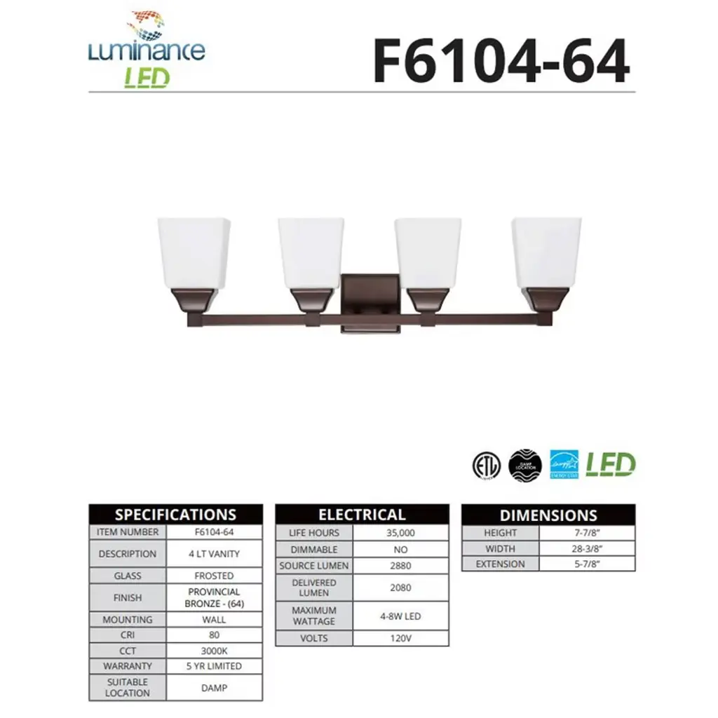 Sunset Lighting LED 4Lt Vanity 8W x 4, 3000K, 2080Lm, CRI80, Non-Dim, Provincial Bronze Bring balanced, efficient light to larger vanities with this four-light LED fixture. The Provincial Bronze finish pairs with frosted glass to deliver soft, even illumination that’s comfortable for daily grooming. Built for reliability with long-life LEDs and rated for damp locations. Key Features: • Four-light integrated LED vanity (4 × 8W) • 3000K color temperature with 80 CRI • 2880 source lumens / 2080 delivered lumens • Frosted glass for soft diffusion • Damp location rated; non-dimmable Specifications: • Item Number: F6104-64 • Description: 4 LT Vanity • Glass: Frosted • Finish: Provincial Bronze (64) • Mounting: Wall • CRI: 80 • CCT: 3000K • Suitable Location: Damp • Life Hours: 35,000 • Dimmable: No • Source Lumen: 2880 • Delivered Lumen: 2080 • Maximum Wattage: 4 × 8W LED • Volts: 120V • Height: 7-7/8” • Width: 28-3/8” • Extension: 5-7/8”