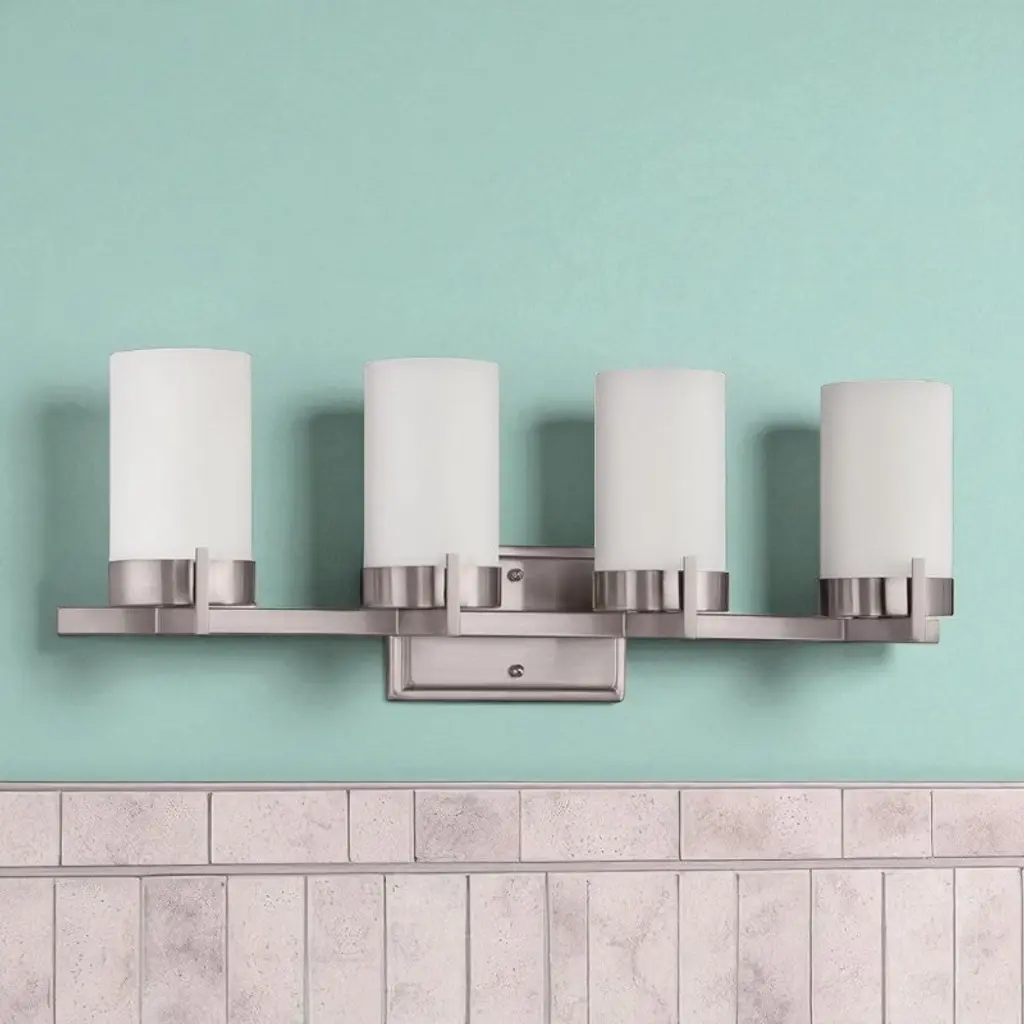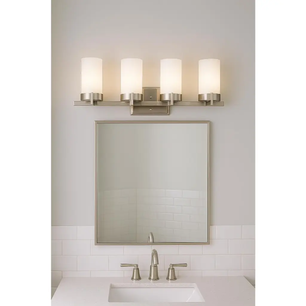 Sunset Lighting 4-Light Vanity Fixture – Bright Satin Nickel Live the bright and comfortable life with this dimmable 4-light vanity from Luminance Brands. Premium materials and a contemporary satin nickel finish elevate bathrooms, hallways, or living spaces with timeless style. Key Features • Dimmable lighting when used with a compatible dimmer (not included). • Contemporary design with bright satin nickel finish and glass shades. • Durable construction for long-lasting performance. • Suitable for dry and damp locations for versatile indoor placement. • Hardwired, corded-electric installation. Specifications • Brand: Luminance Brands • Item/Model: F2864-80 • Finish: Bright Satin Nickel (satin) • Material: Glass; Metal • Light Source: Incandescent (E26 medium base) • Bulbs: 4 × 100W max (not included) • Voltage: 120V • Overall Dimensions: 27.13" W × 9.5" H × 6" D (approx.) • Room Type: Bathroom, Living Room, Hallway (indoor use) • Location Rating: Damp • Included Components: 1 Vanity Fixture • Weight: 6.44 lb