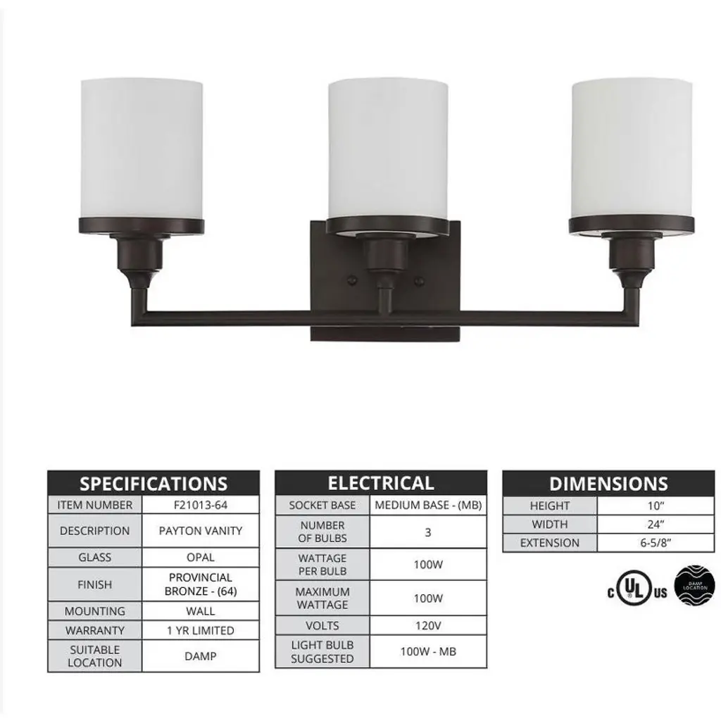 b>Sunset Lighting Payton 3-Light Bathroom Vanity Light – Provincial Bronze (F21013-64) Add classic sophistication to your bathroom with the Payton 3-light vanity fixture. Featuring a provincial bronze finish and opal glass shades, this fixture is both elegant and practical. Ideal for bathroom spaces needing both style and brightness. Key Features: • Bronze finish with Opal Glass shades • Accommodates 3 x 100W bulbs (not included) • Corded Electric power source • Suitable for bathroom vanity installations • US-style plug format Specifications: • Model: F21013-64 • Finish: Provincial Bronze • Fixture Dimensions: 24" L x 1" H x 24" W • Shade Dimensions: 4.75" W x 6" H • Shade Material: Glass • Maximum Wattage: 100W per bulb • Voltage: 120V • Collection: Payton