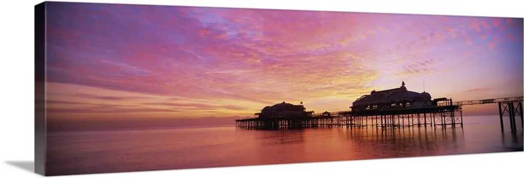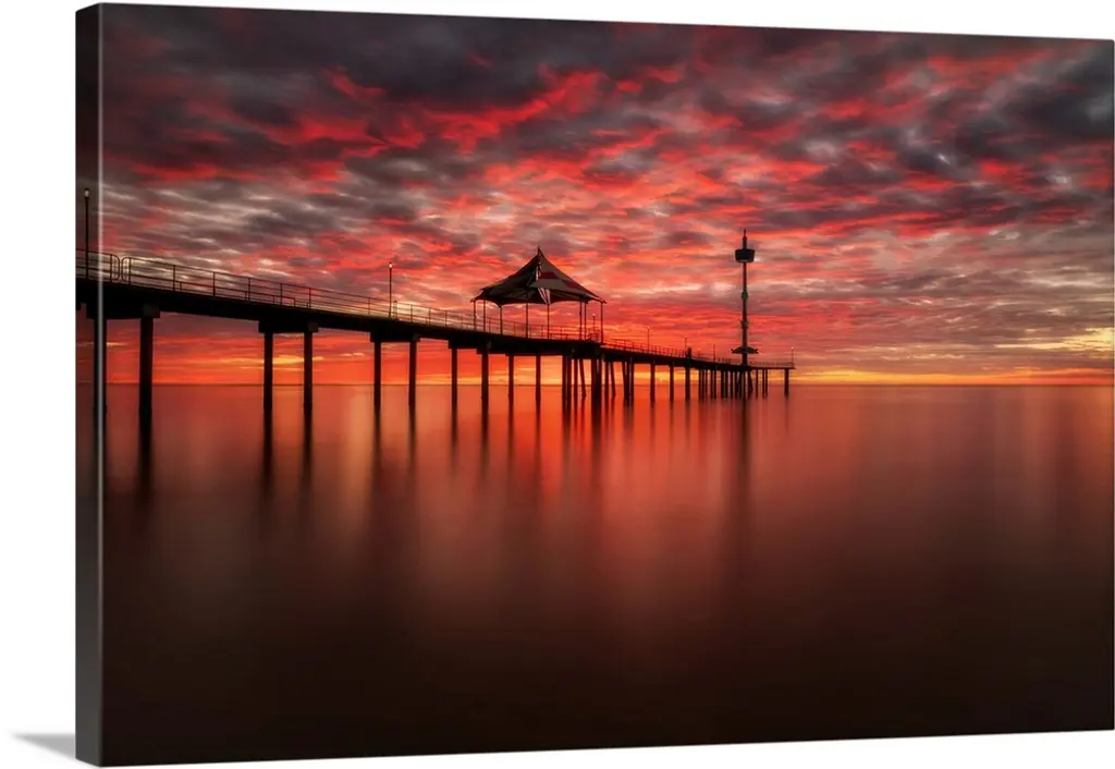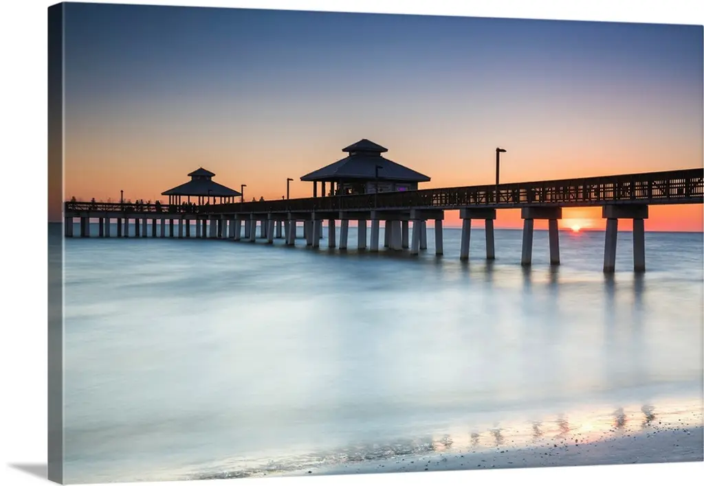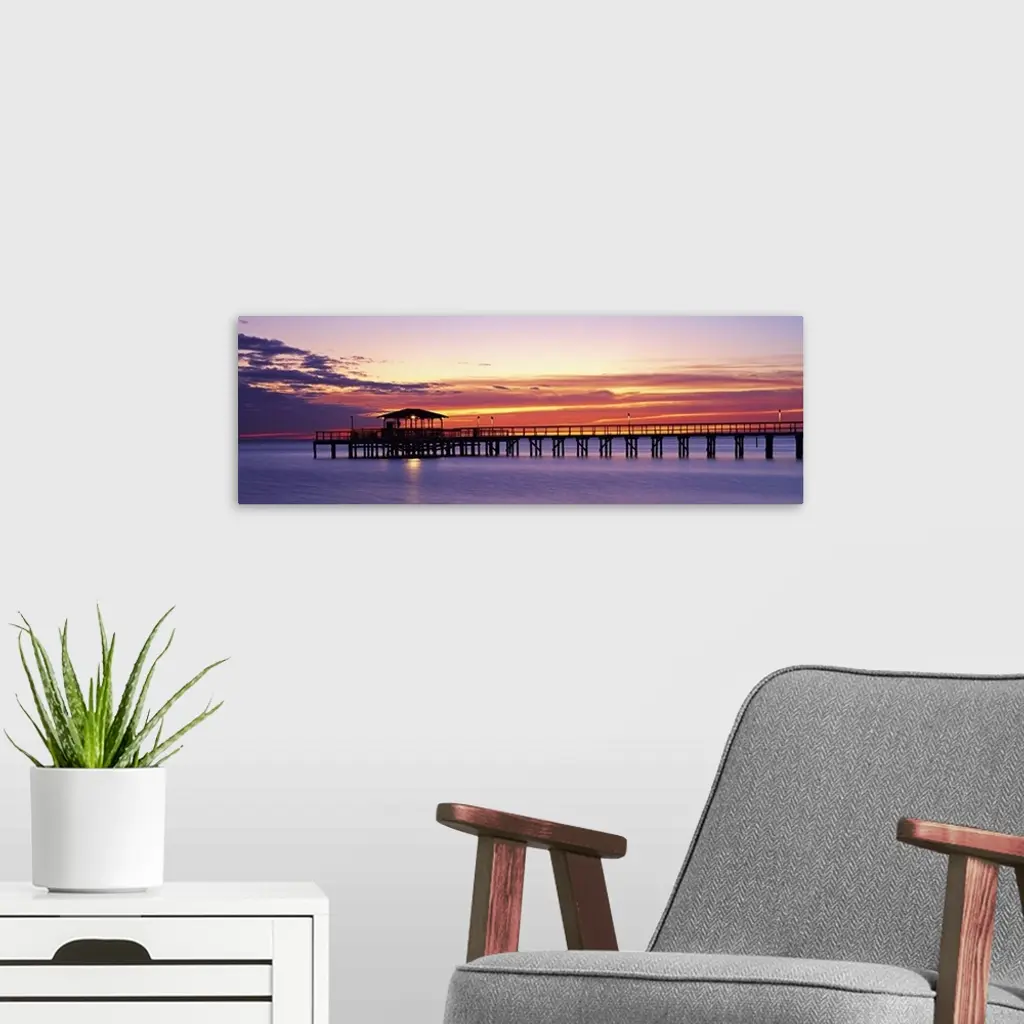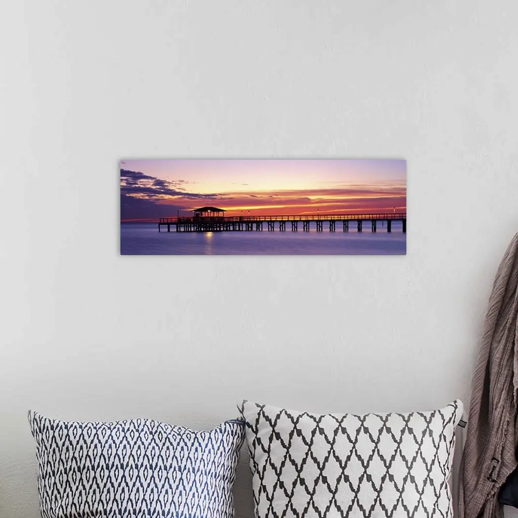 Wide angle photograph of Mobile Pier surrounded by deep purple waters beneath a vibrant sunset, in Mobile, Alabama.