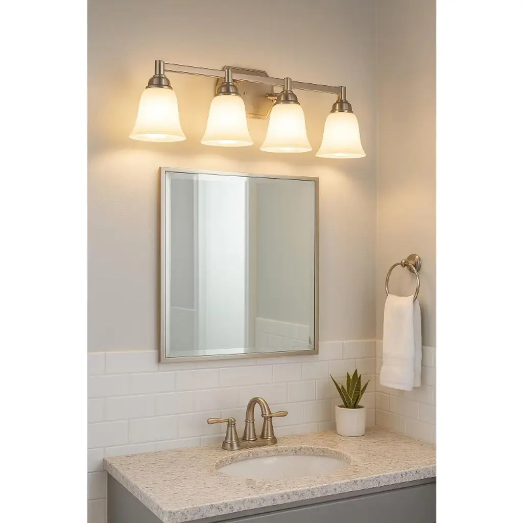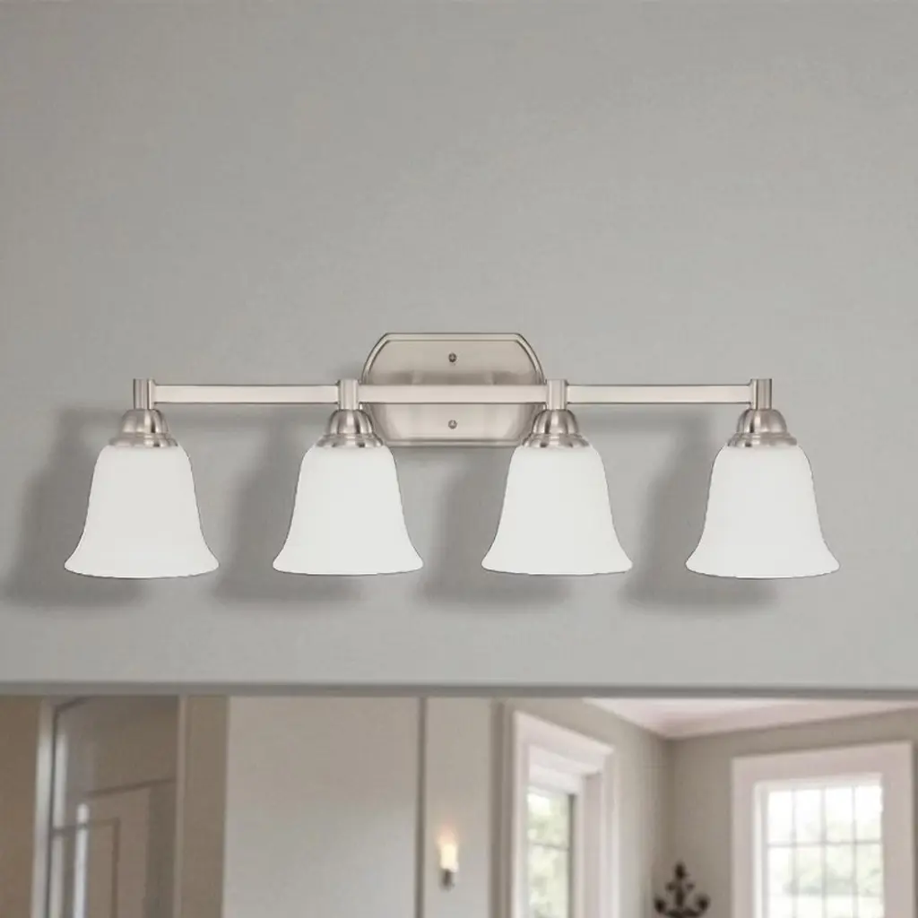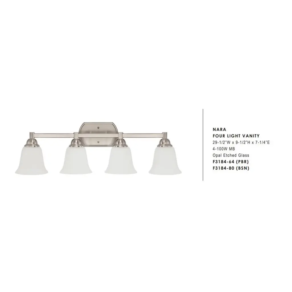 Sunset Nara Four Lights Vanity – Bright Satin Nickel Elevate your bath with a clean, contemporary 4-light vanity. The Bright Satin Nickel finish pairs with opal etched glass shades for soft, even illumination that flatters any mirror or vanity setup. Key Features • Contemporary 4-light design for balanced, wide vanity coverage. • Opal etched glass shades diffuse light for a comfortable glow. • Bright Satin Nickel finish complements modern and transitional décor. • Uses standard medium-base bulbs for easy lamping (bulbs not included). Specifications • Item Number: F3184-80 • Finish: Bright Satin Nickel • Glass: Opal Etched • Dimensions: 29-1/2" W × 9-1/2" H × 7-1/4" E • Lamping: 4 × 100W max, Medium Base (MB)