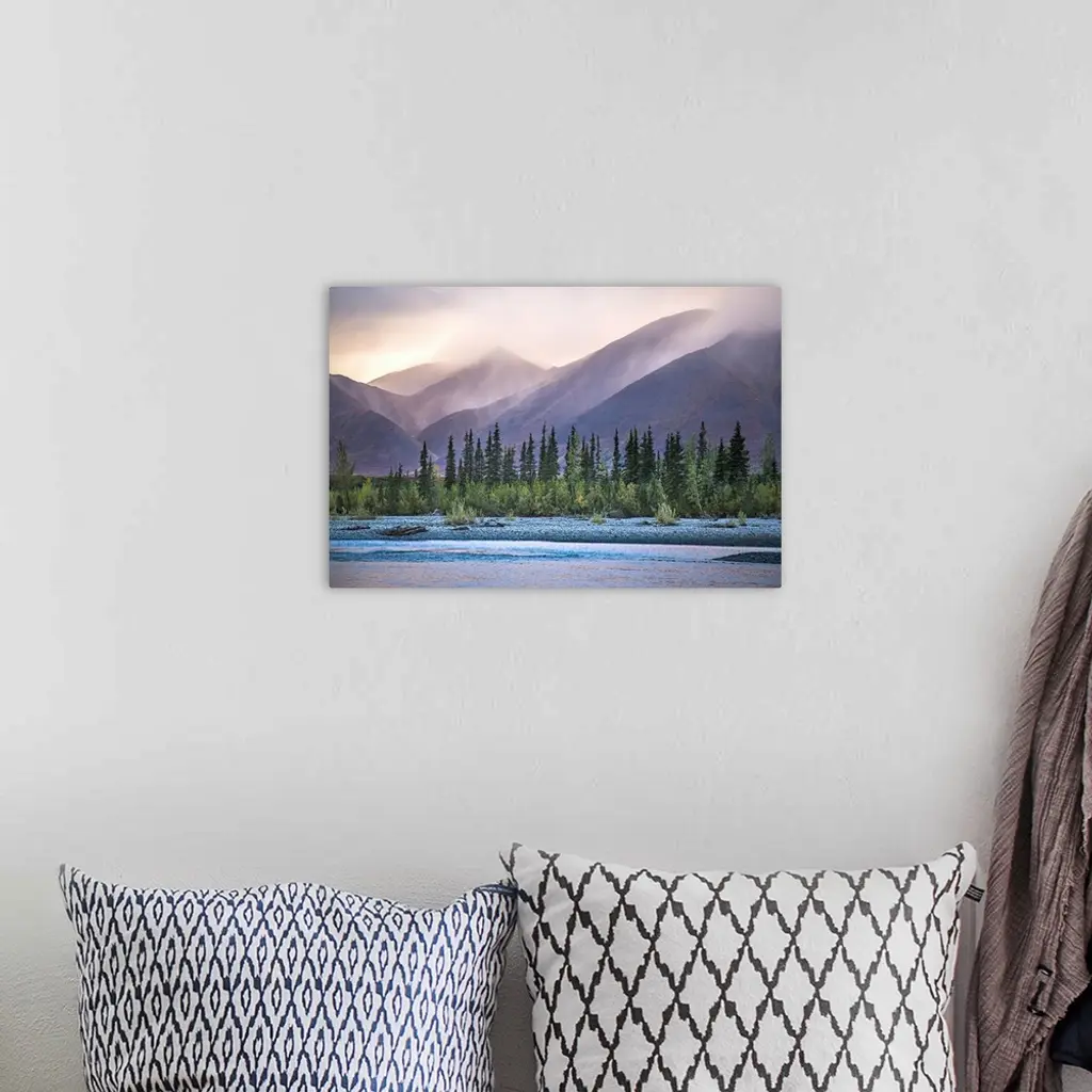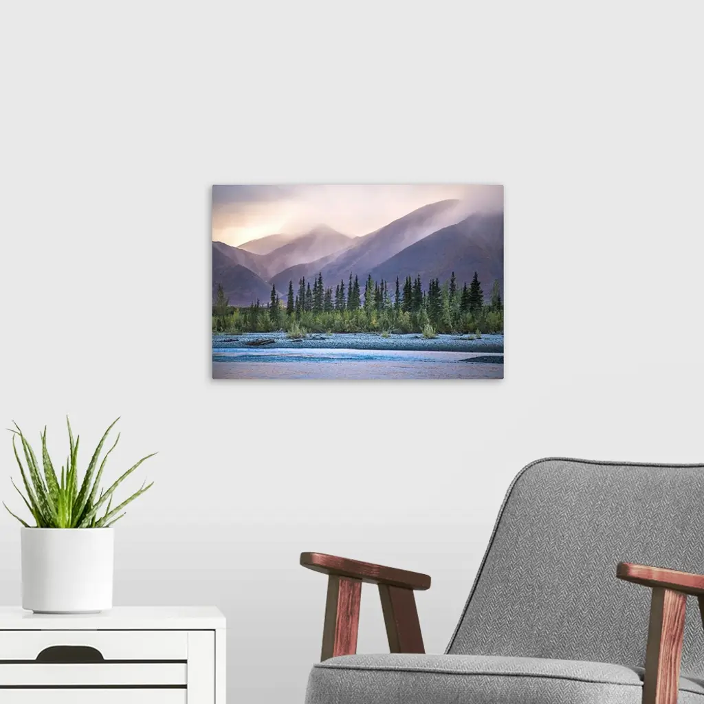 Rain and snow squalls race over the mountains during sunset on the Kelly River, in the western Brooks Range of Noatak National Preserve, Alaska, USA.