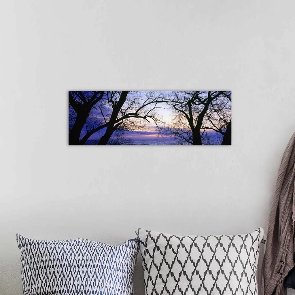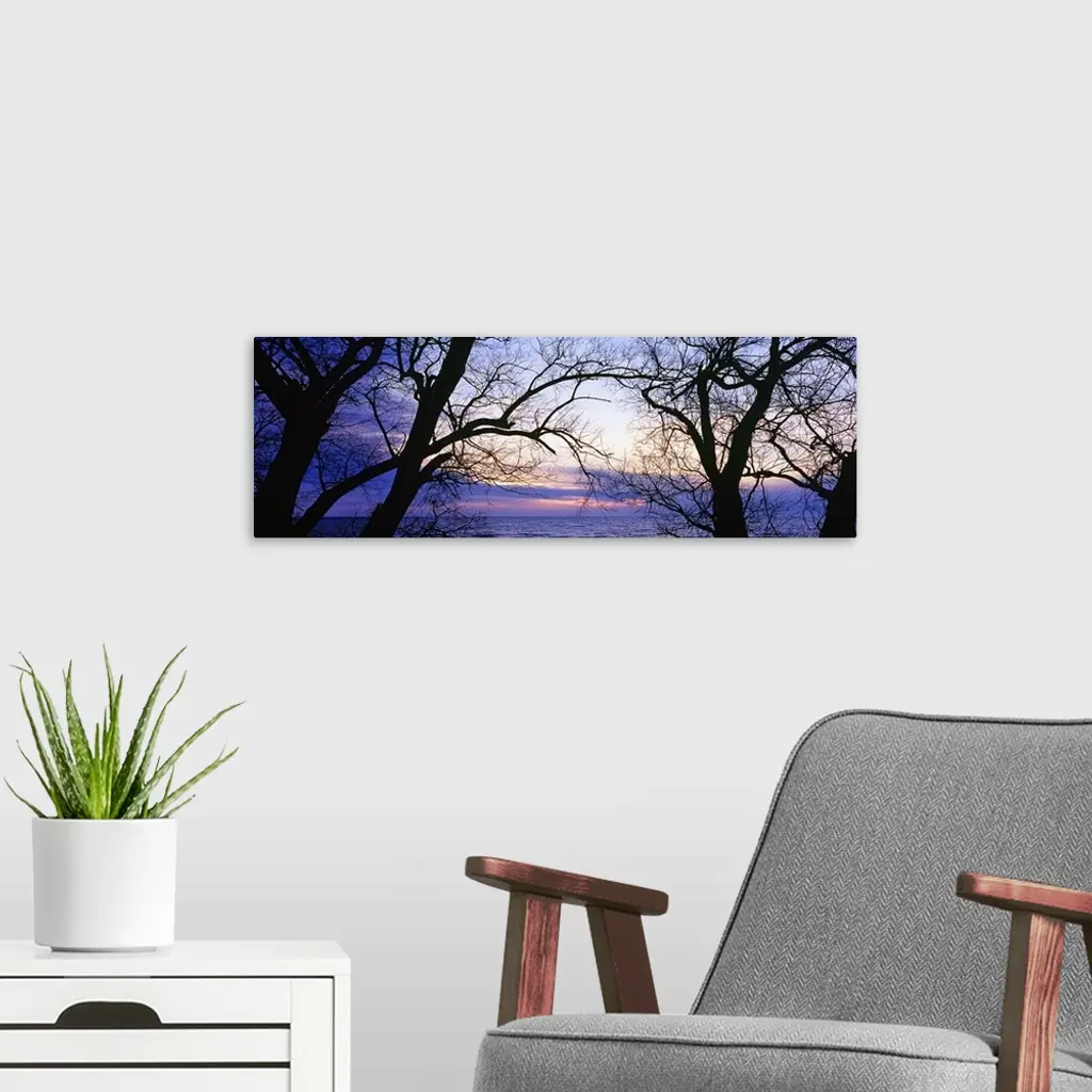 Horizontal panoramic photo of Lake Erie seen between the bare tree branches as the sun sets behind clouds.
