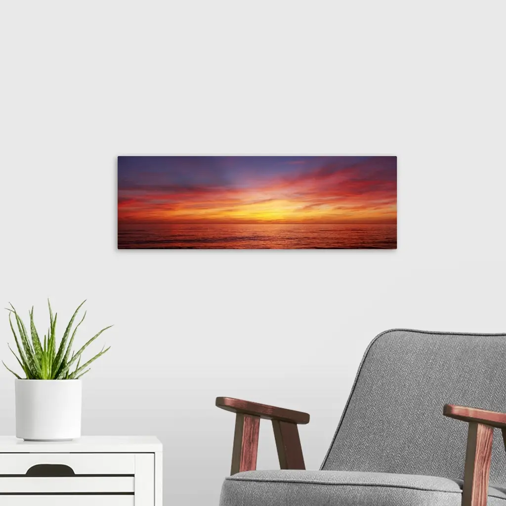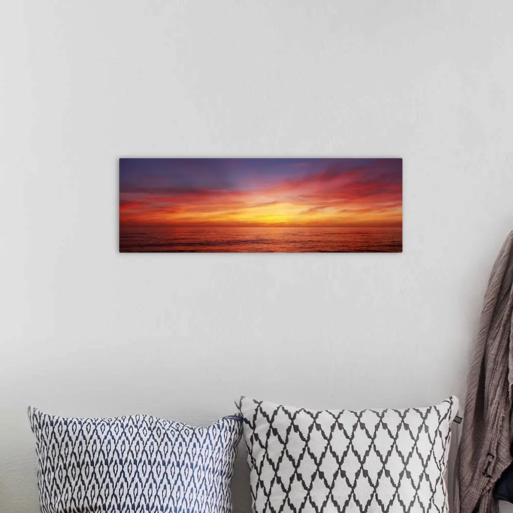 A panoramic photograph of the sun descending behind clouds over the ocean.