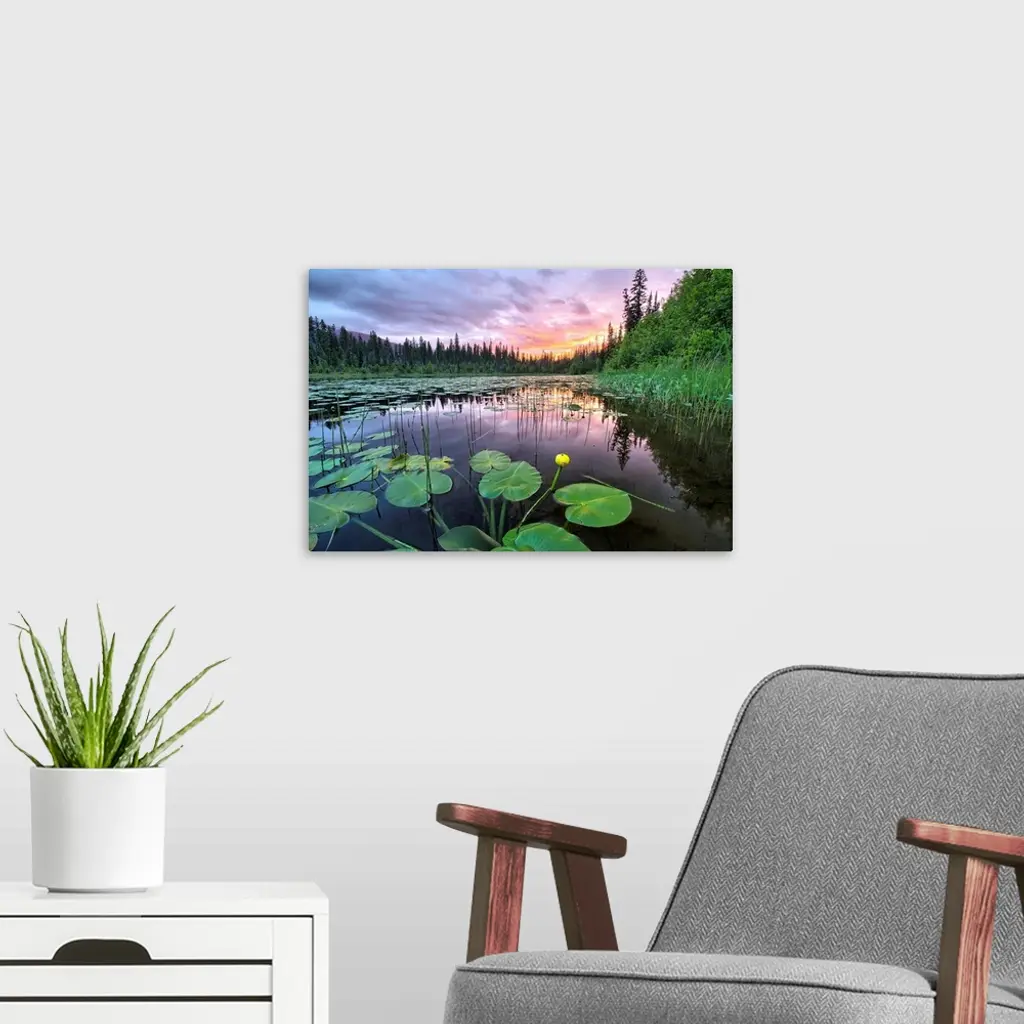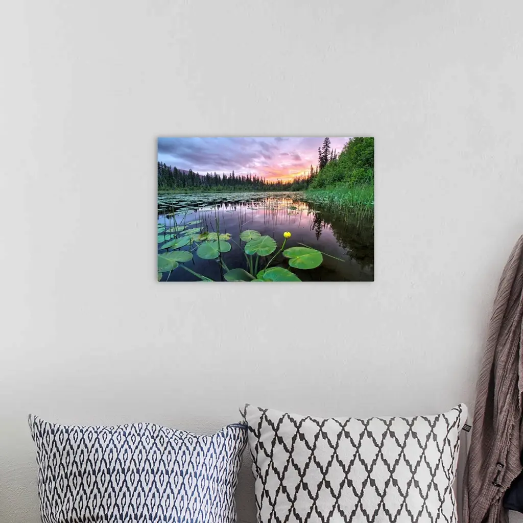Sunset over an unnamed lake with water lilies along the Yellowhead Highway, Canada wall art for home and office decor. Discover canvas art prints, photos, mural, big canvas art and framed wall art in GreatBigCanvas.com's varied collections.