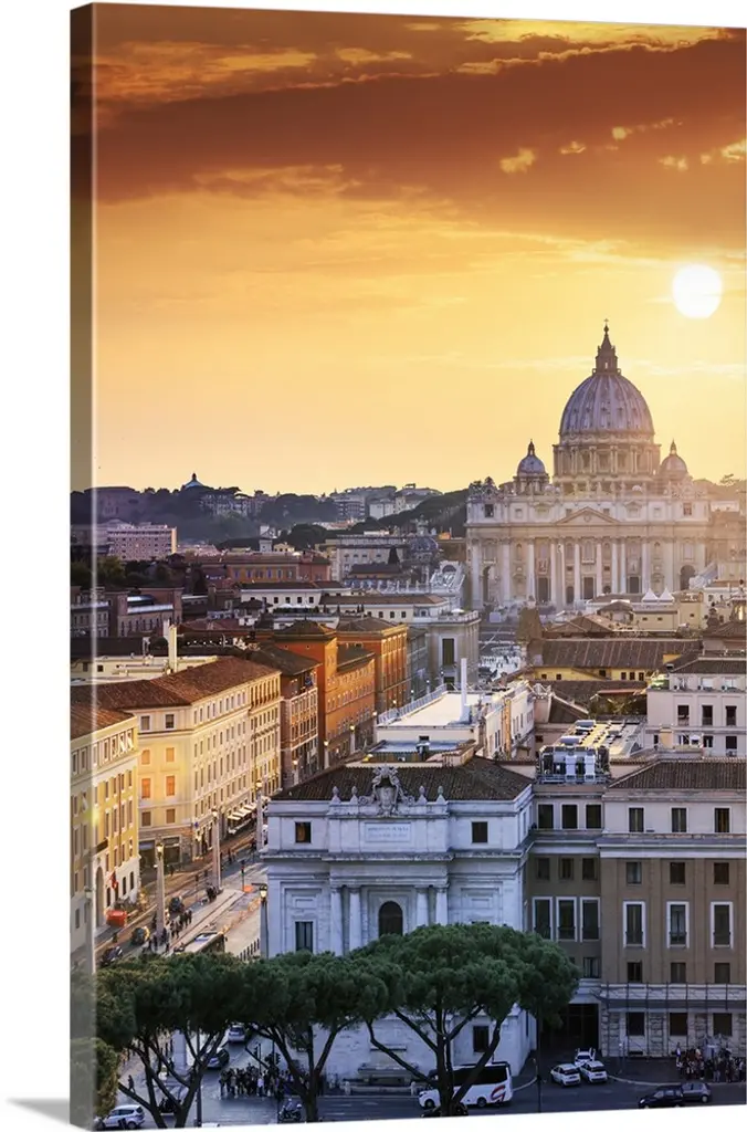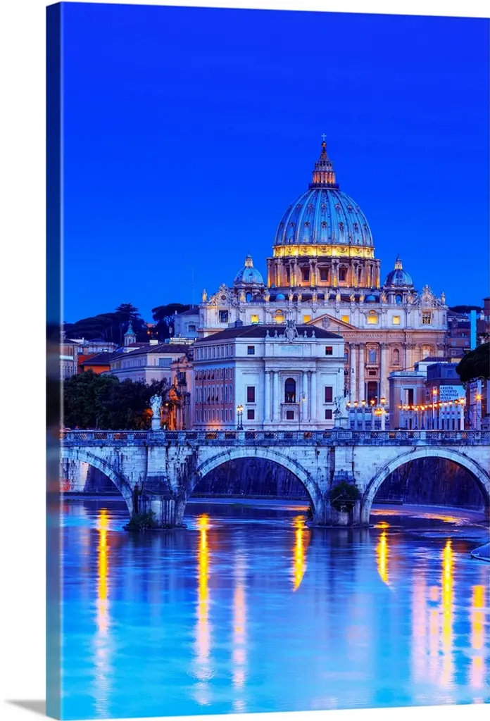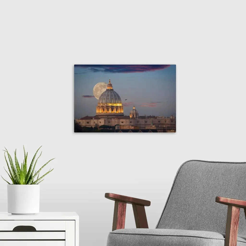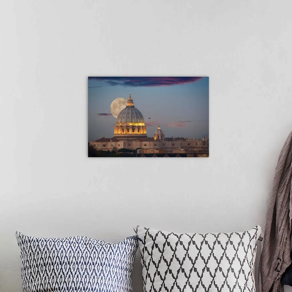 Fine art photograph of the moon rising right behind St. Peter's Basilica in Rome.