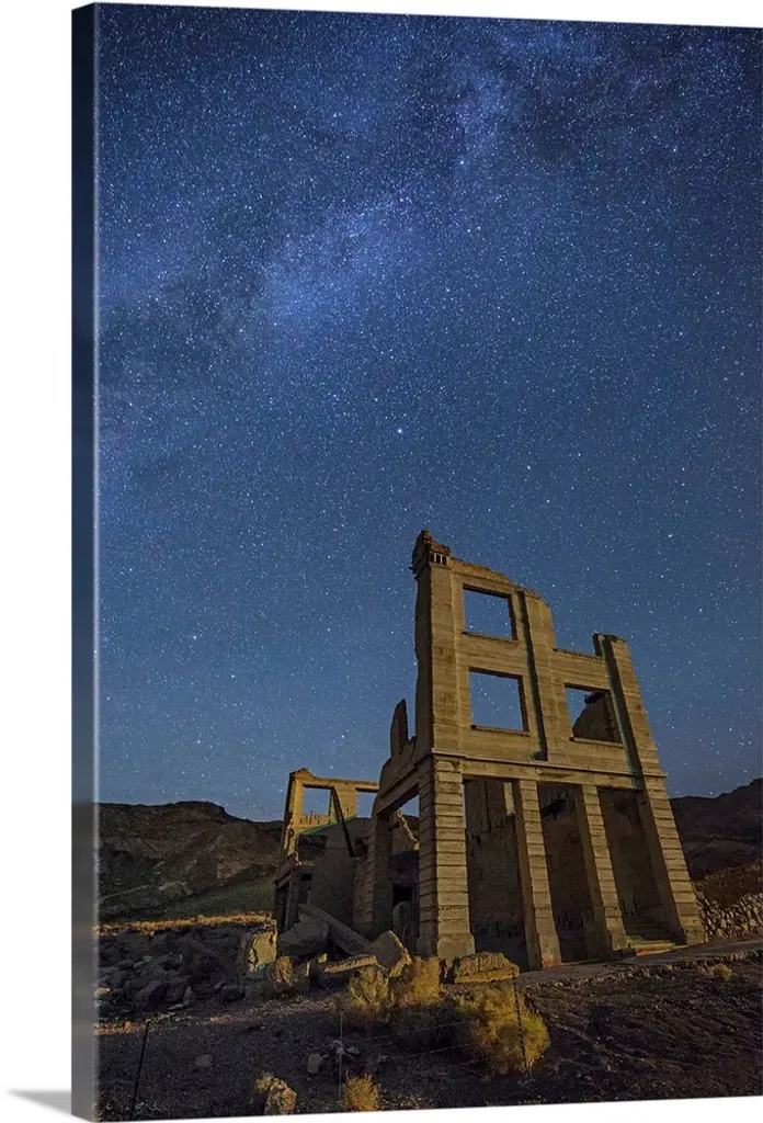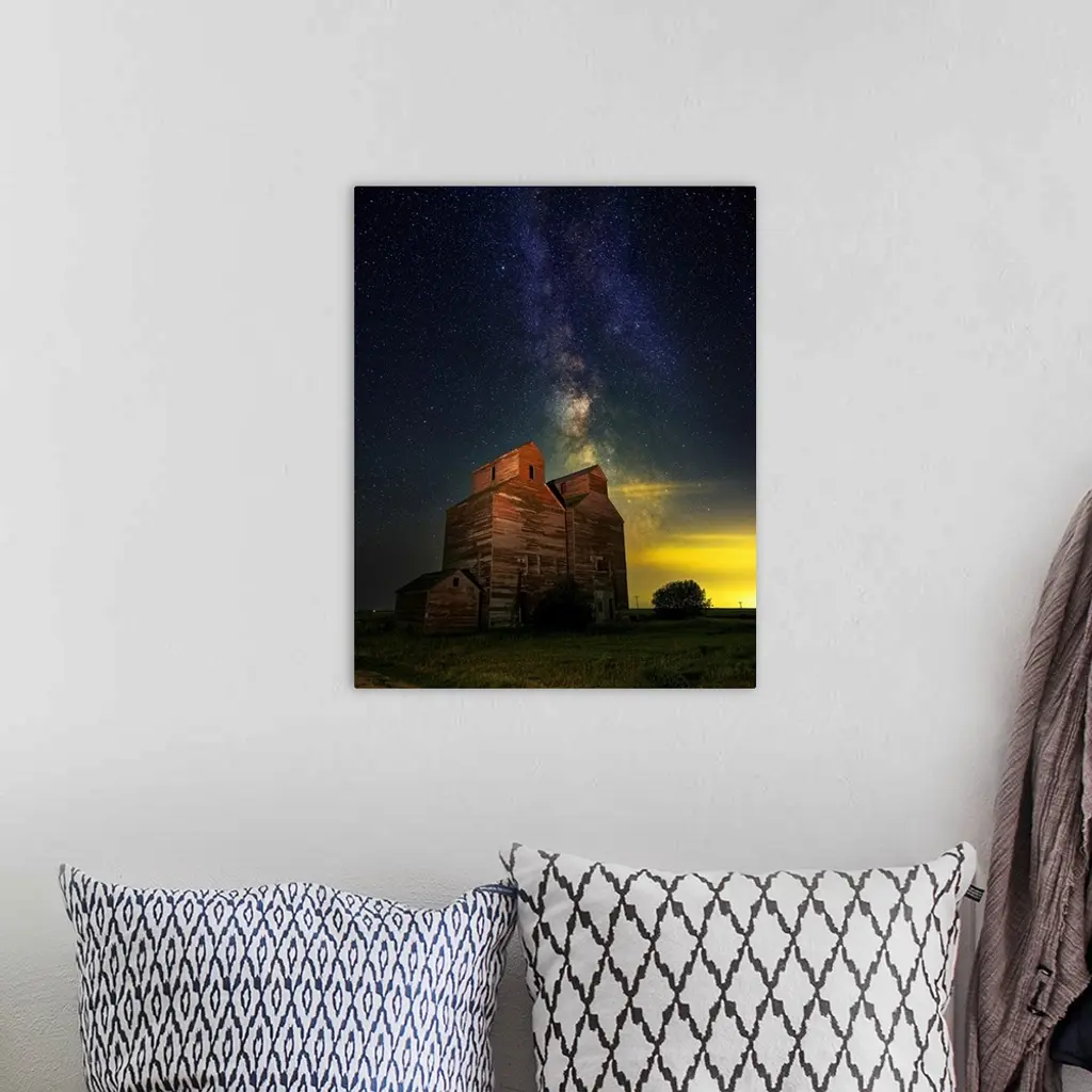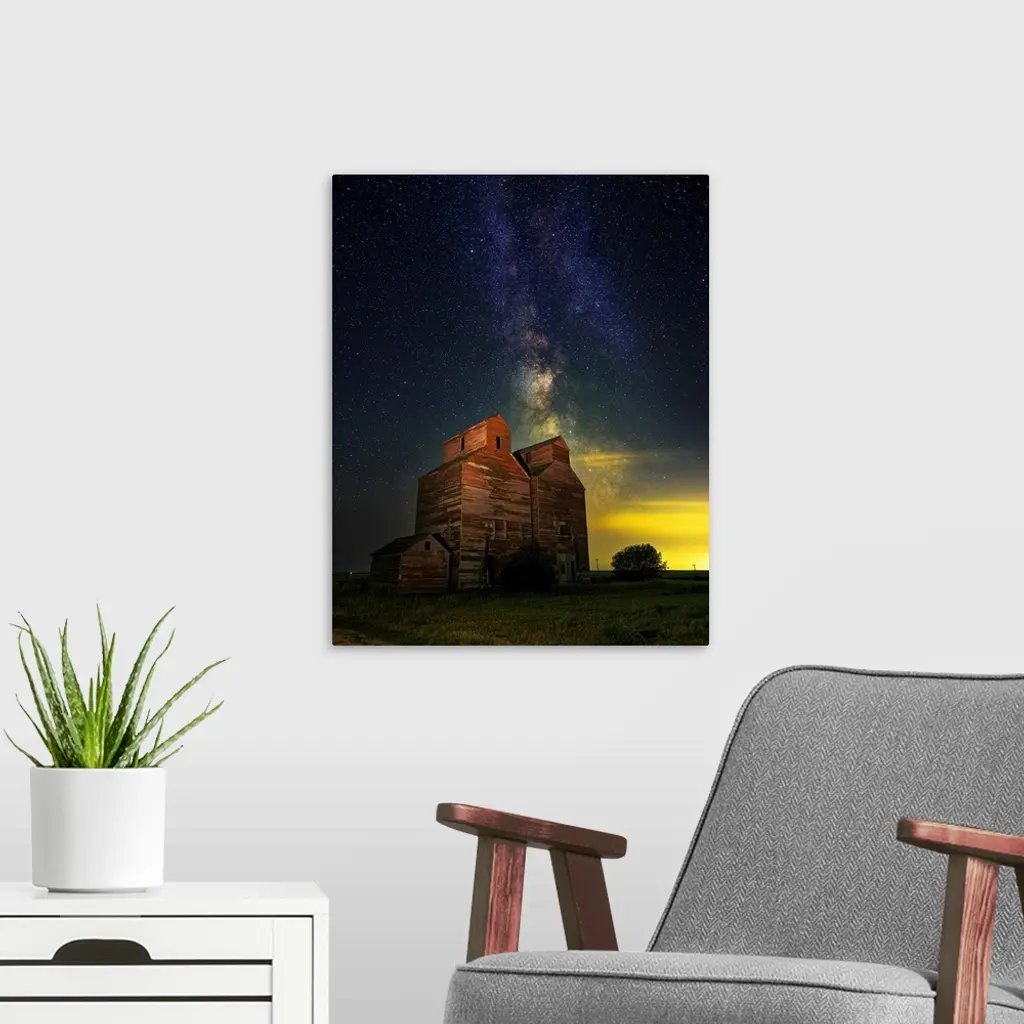 The Milky Way glows behind an old grain elevator in the ghost town of Arena, North Dakota.