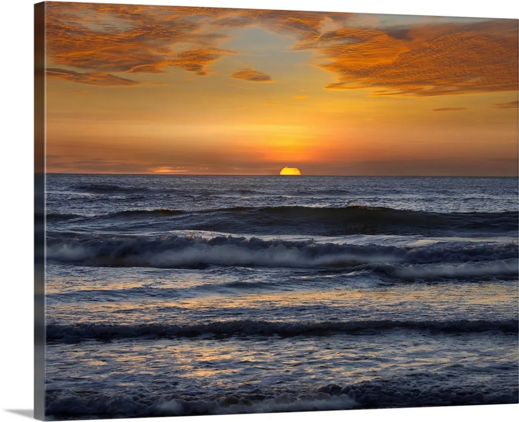 The sunset dips below the ocean horizon as ocean swells dash against the sandy tropical shoreline.