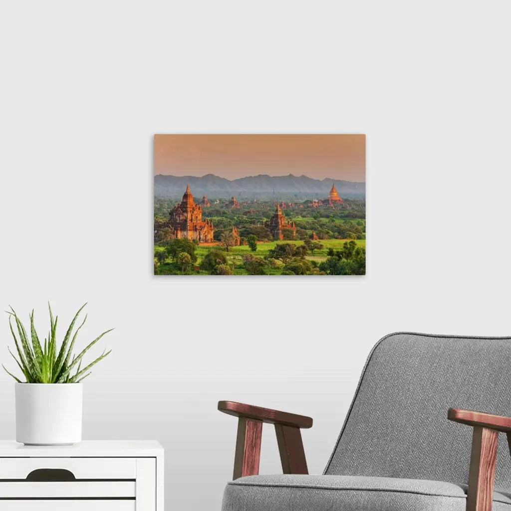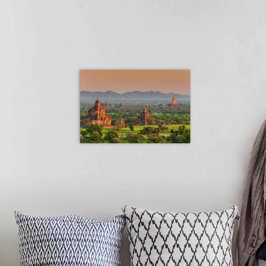 Panoramic view at sunset over the ancient temples and pagodas, Bagan, Myanmar or Burma