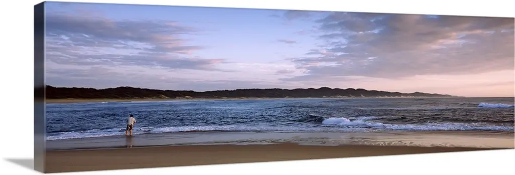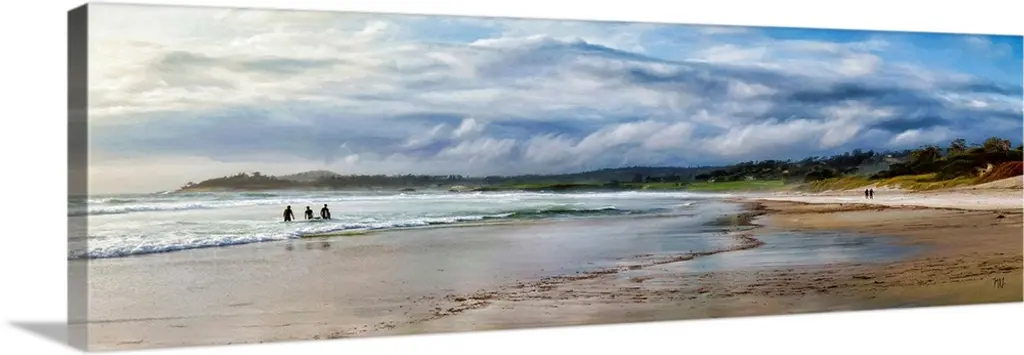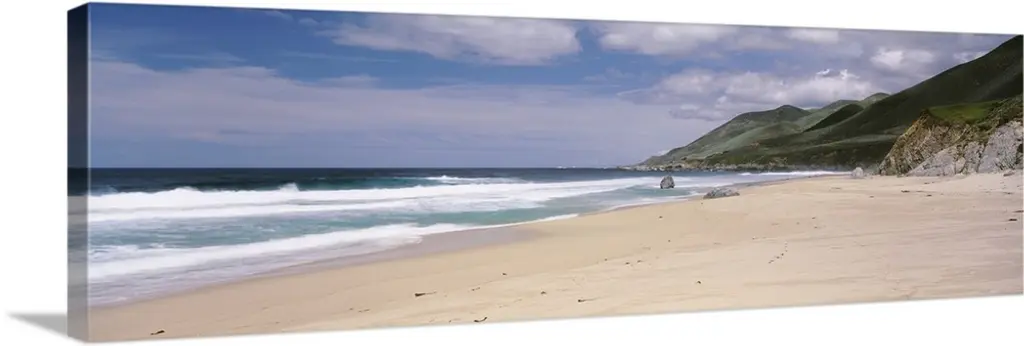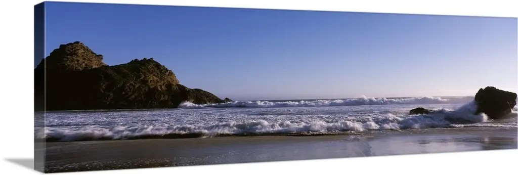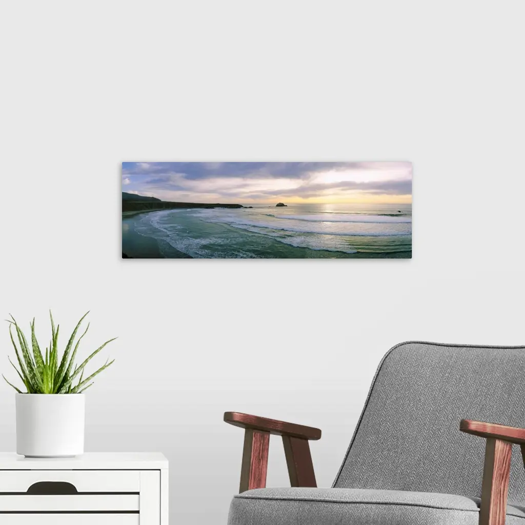 This panoramic wall art is a wide angle photograph of waves washing on to a beach taken from a cliff above the shore.