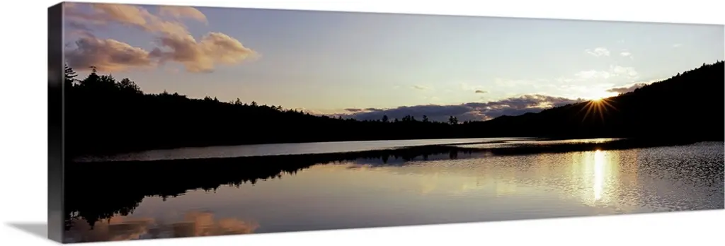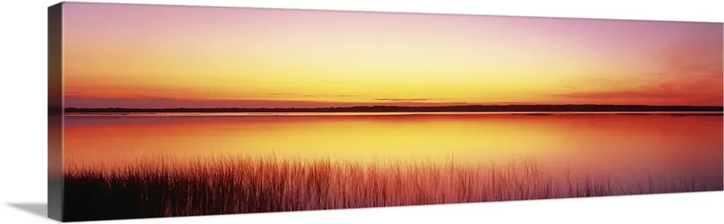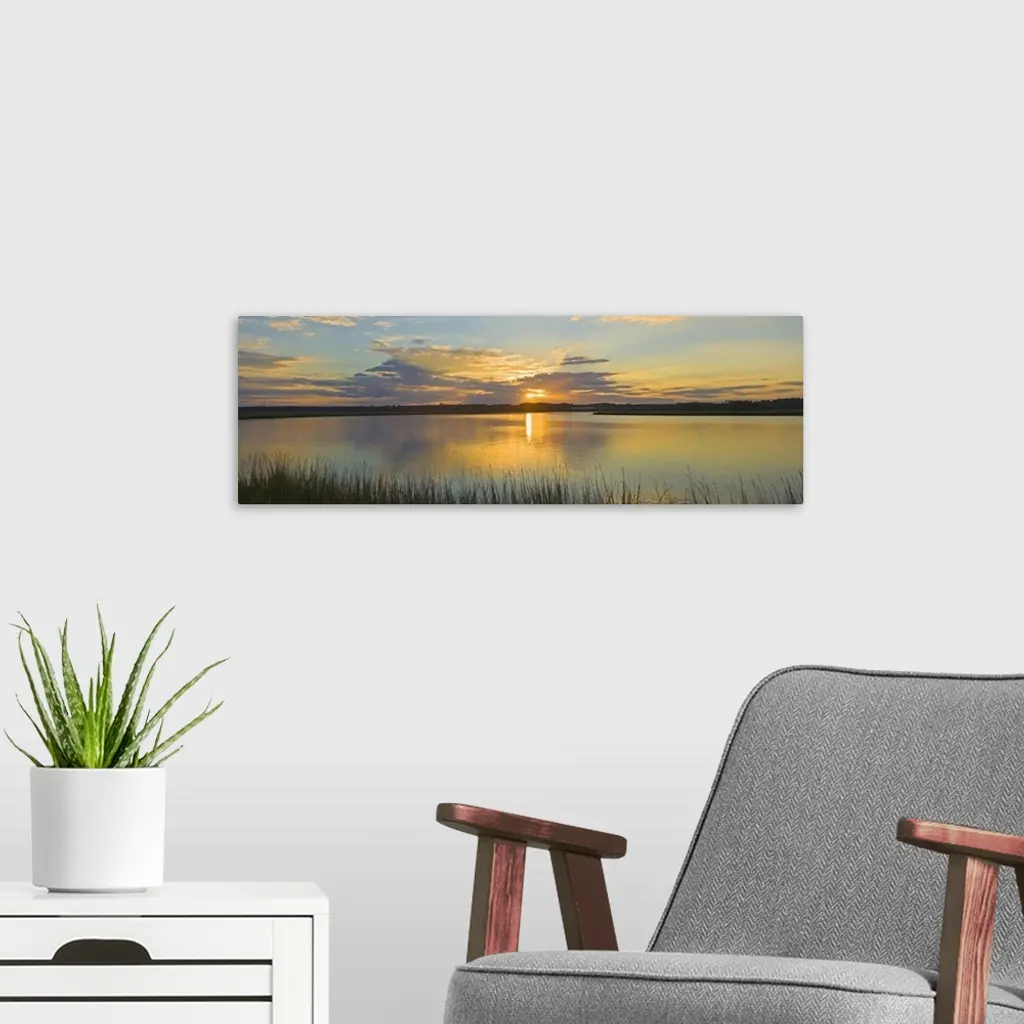 Tall grass lines the bottom of this picture with a wide angle view of a body of water as the sun begins to set over it.