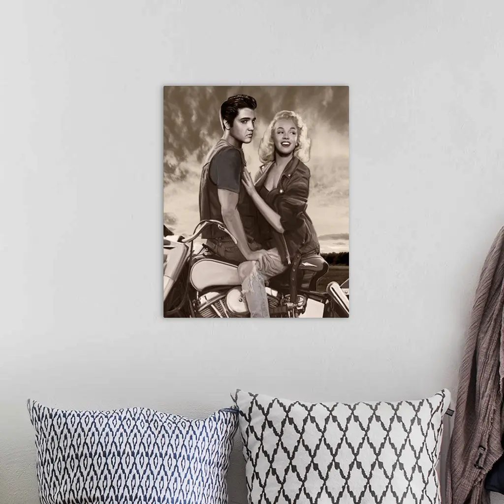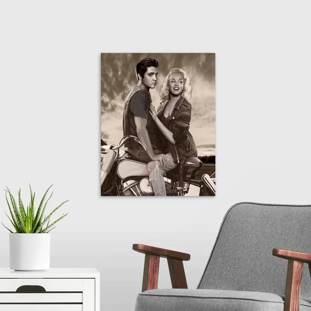 Digital fine art image of Marilyn and Elvis on a motorcycle.