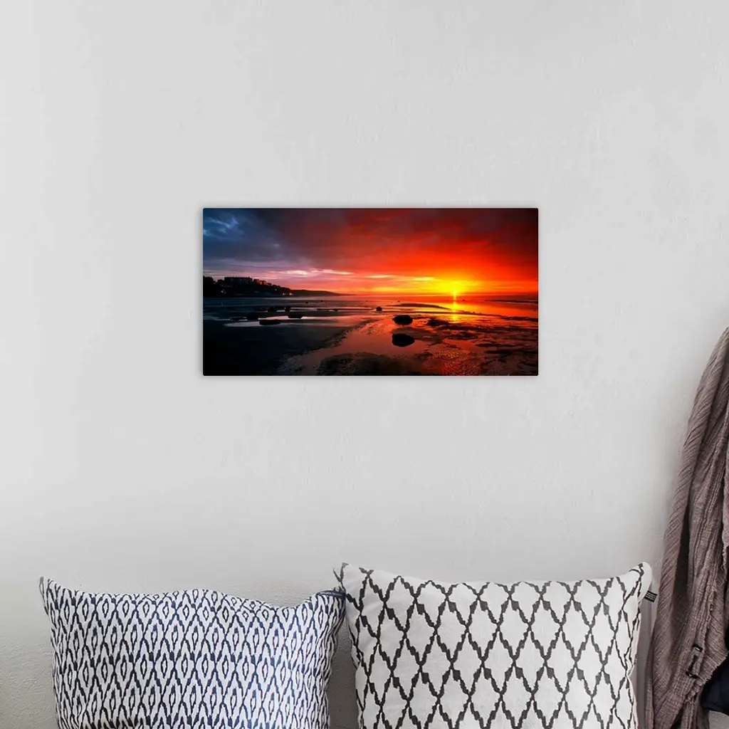 Panoramic photograph that captures a colorful sunset on the shores of England. The calm beach is highly contrasted by the lively sky in the background.