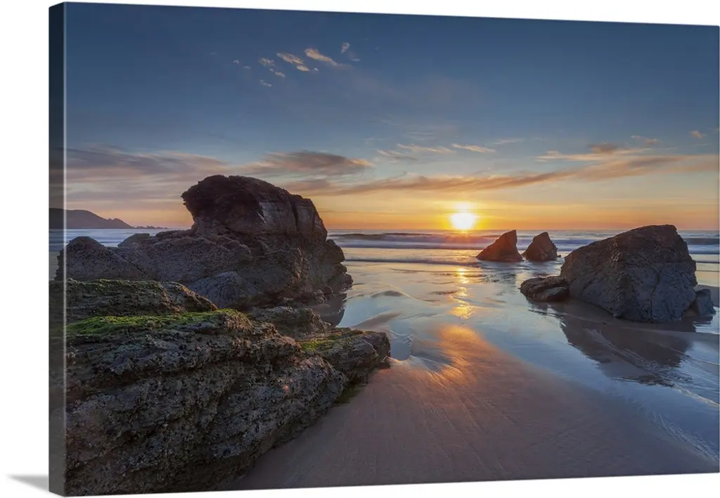 Photograph of rocky shore at dusk. There are huge rocks emerging from the sand and ripples of water receding into the ocean. The sky is cloudy and colorful.