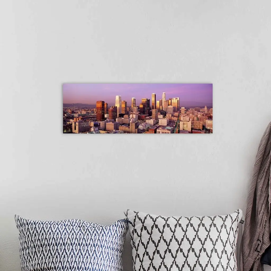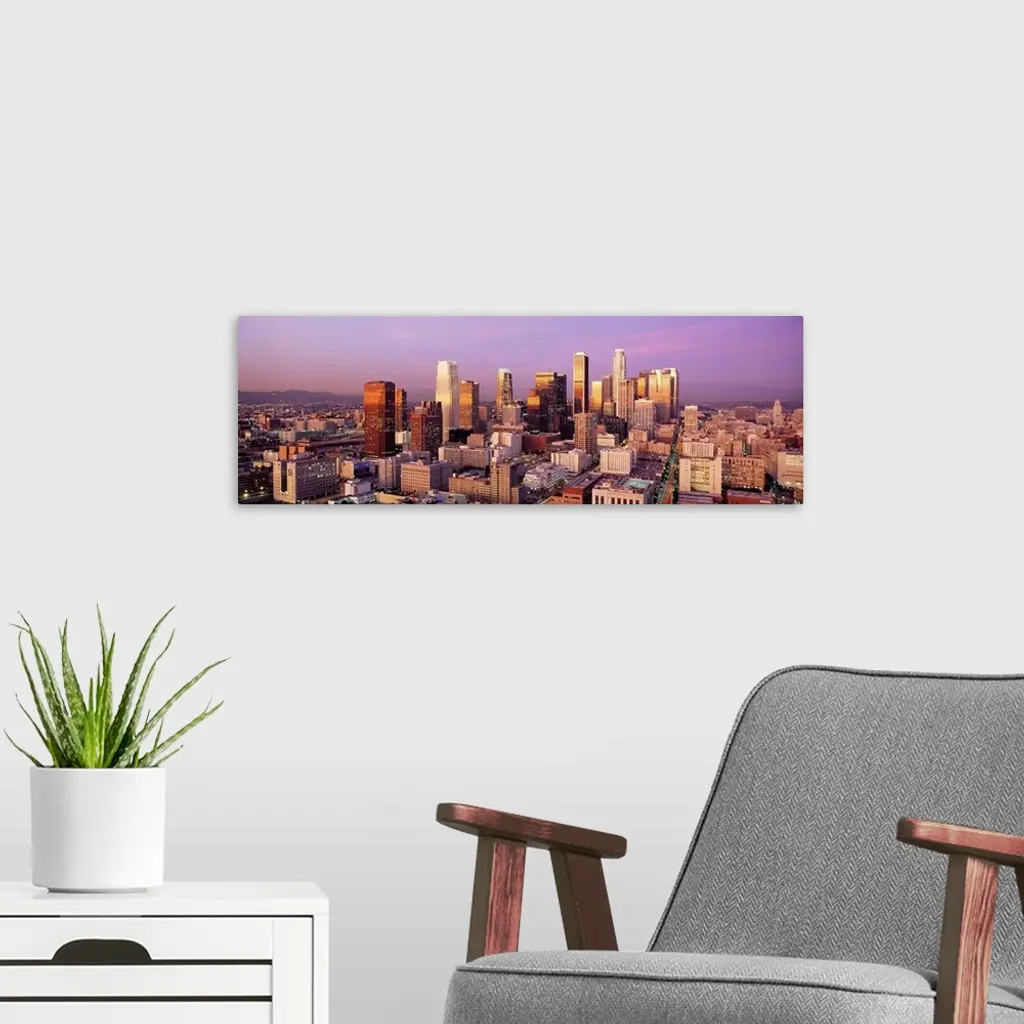 Giant horizontal panoramic photograph of the city of Los Angeles, California (CA) as the sun begins to set and its rays shine off the skyscrapers.