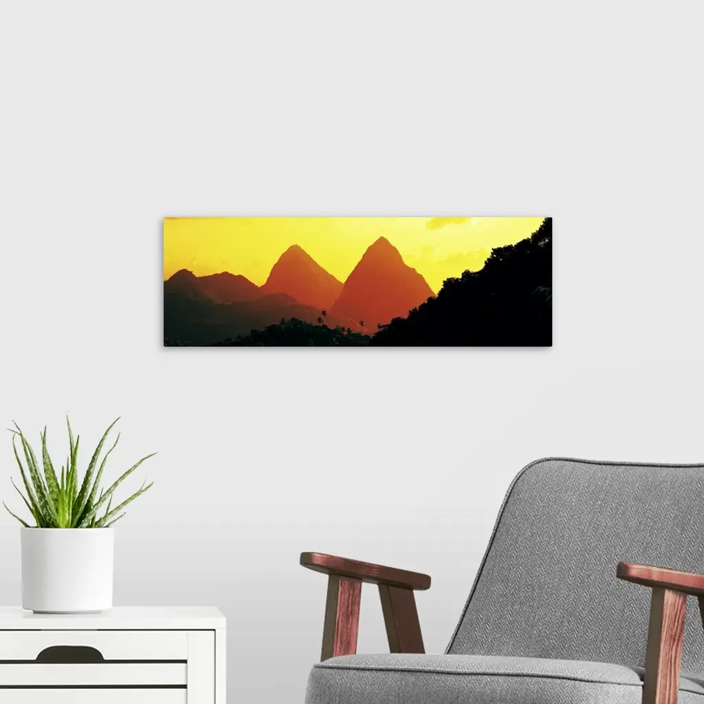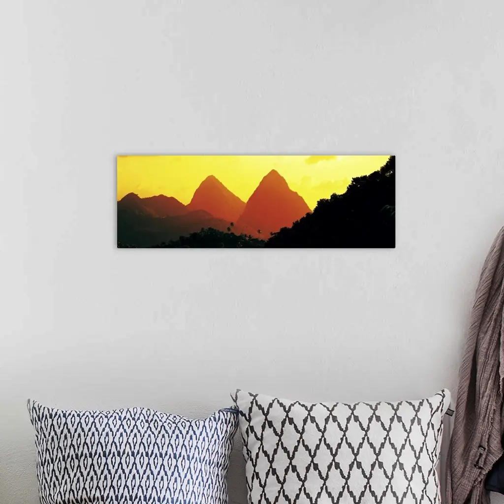 Panoramic photograph of mountain silhouettes with forest tree tops in the foreground.