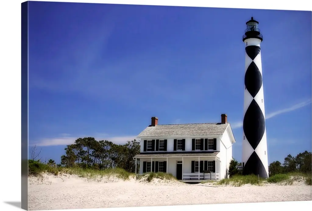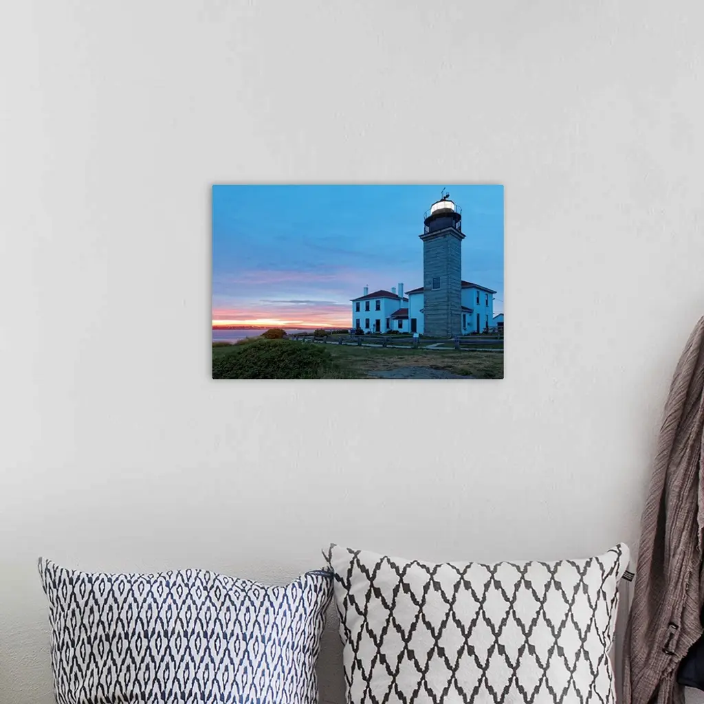 Photograph of lighthouse and building near water's edge under a cloudy sky at dusk.