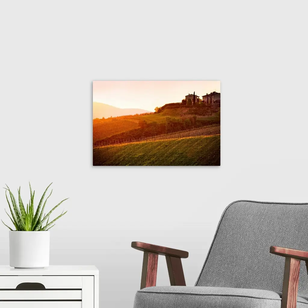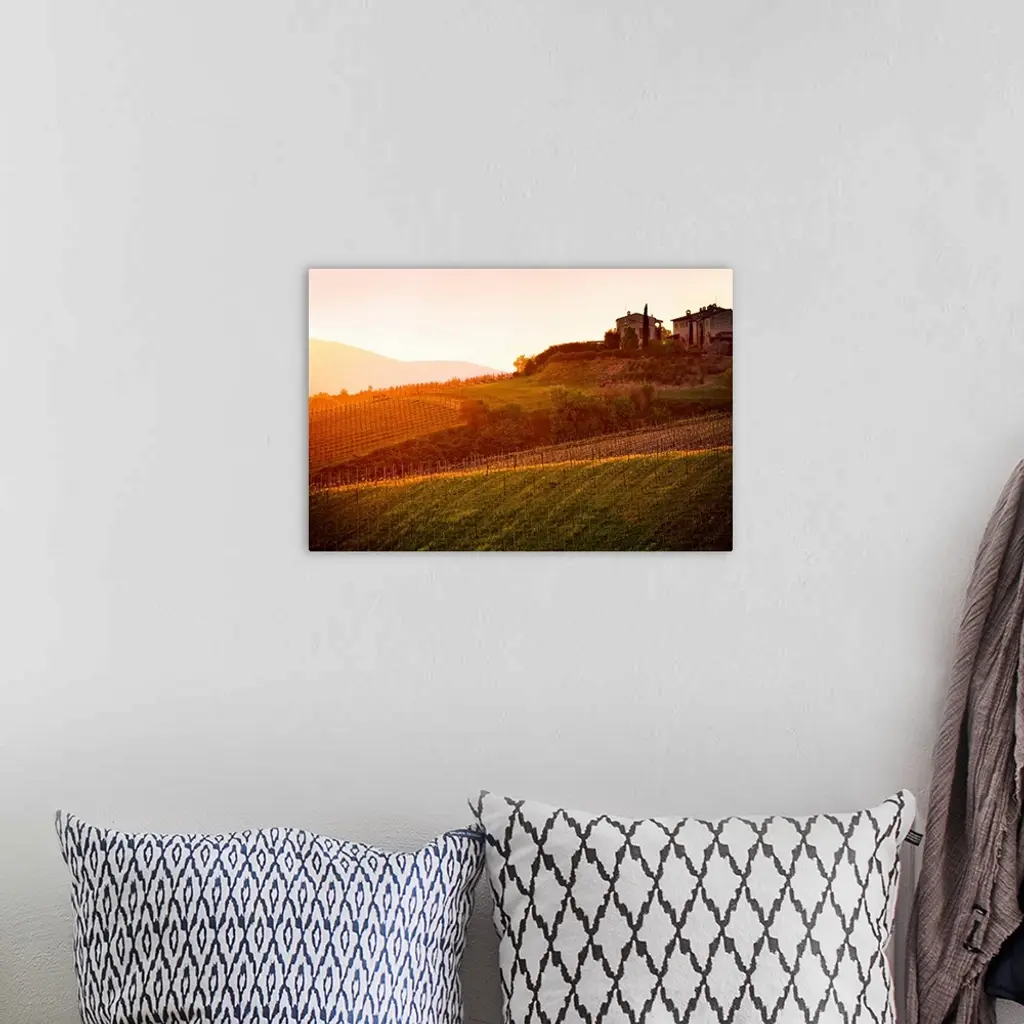 The setting sun shines its last rays over a picturesque villa and its fields in this photo of Tuscanny, Italy. Warm, relaxing tones dominate.