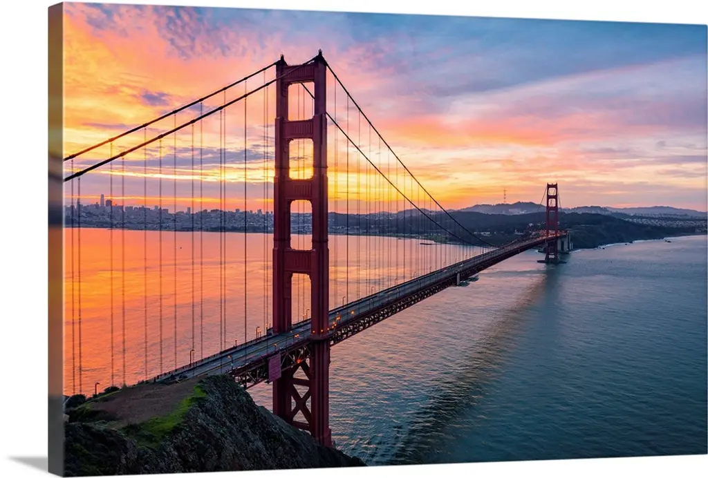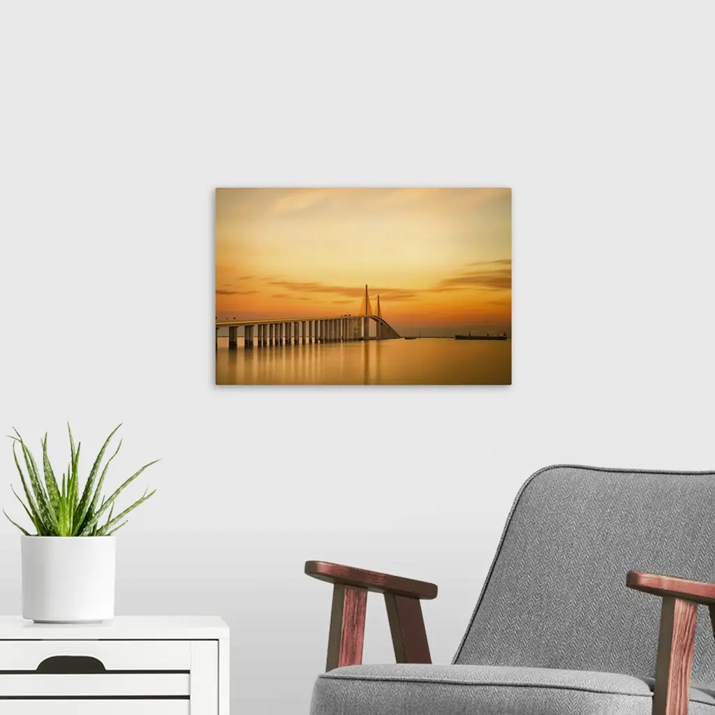 Photograph of overpass crossing water at sunrise under a cloudy sky.