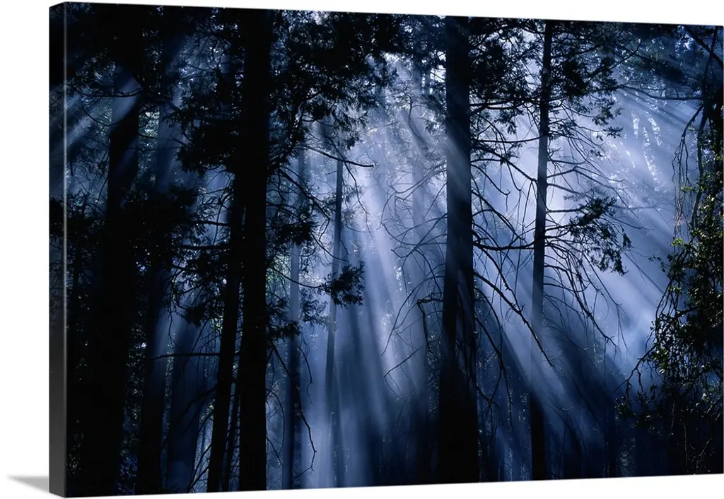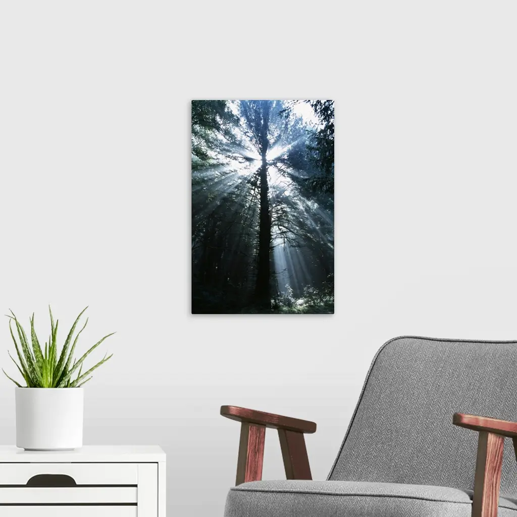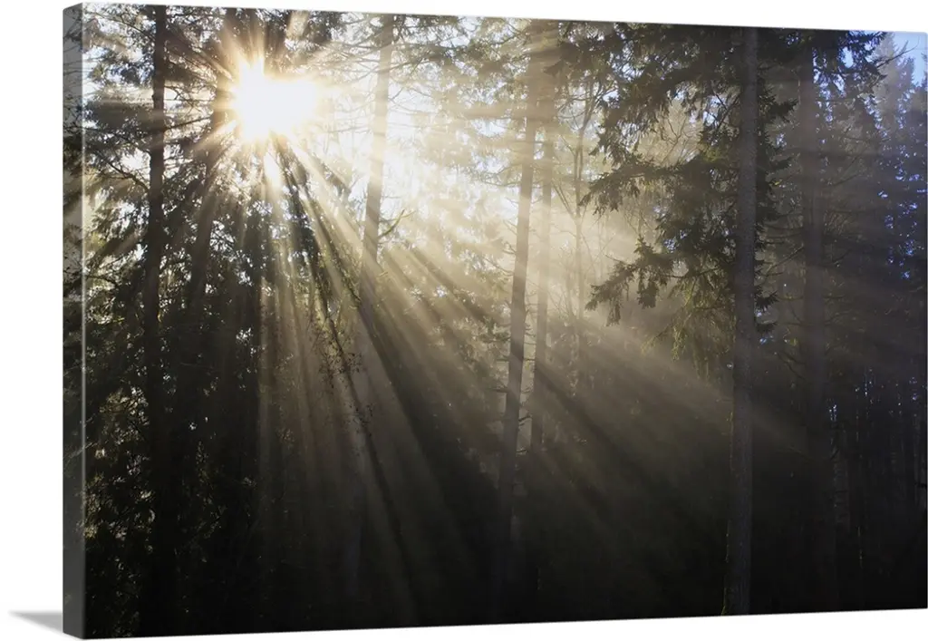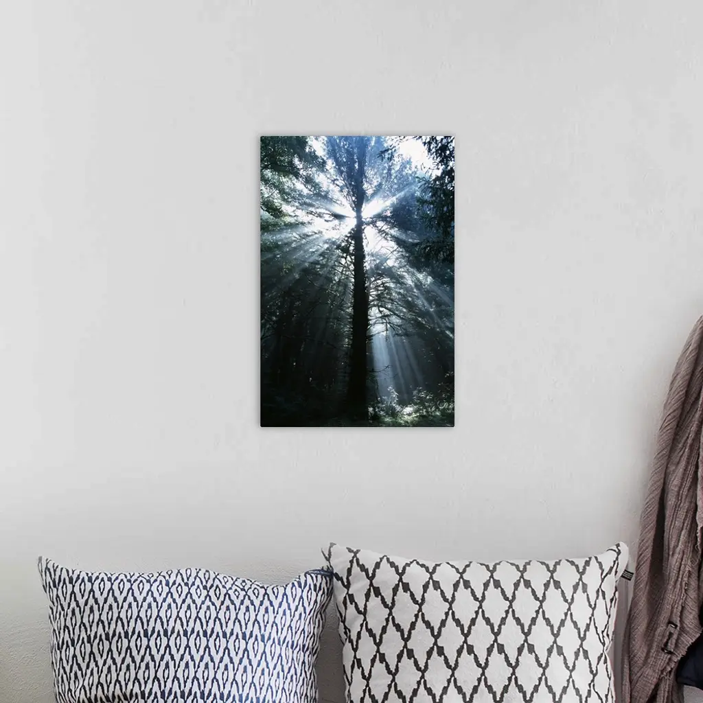 A picture taken in a forest while looking up through the trees as the sun rays beam through.