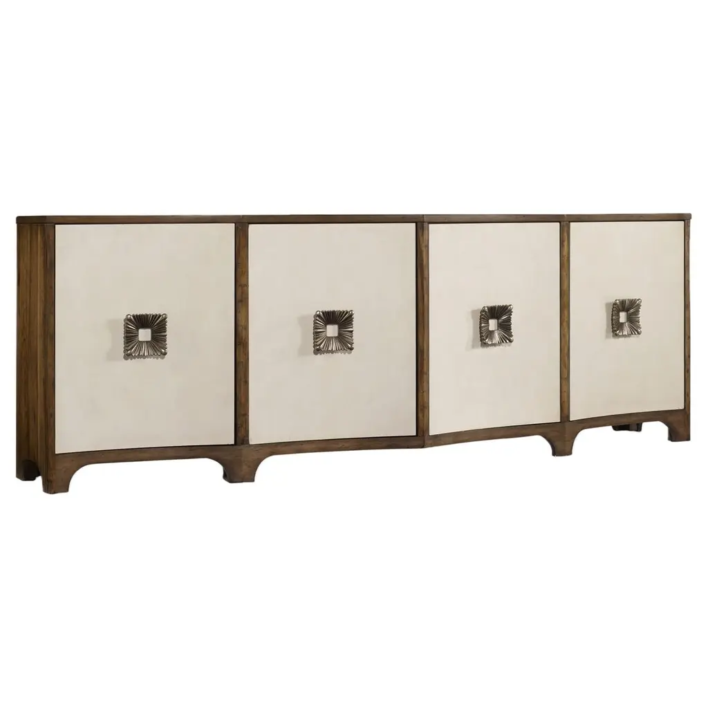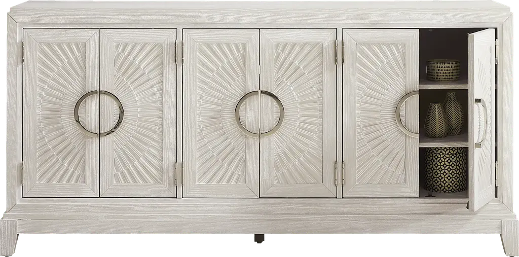 With textures and contours accompanying a stately air and commanding presence, the Sunside Way console is a perfect complementary piece in a room befitting the most eminent of royalty. Constructed using solid poplar in a sand finish, this contemporary piece showcases a handsome silhouette with a refined square shaped frame, while its six doors boast metallic half circle pull handles and an aristocratic design with carved radial motifs. Behind each pair of doors lie 2 spacious shelves perfect for storing your entertainment essentials.