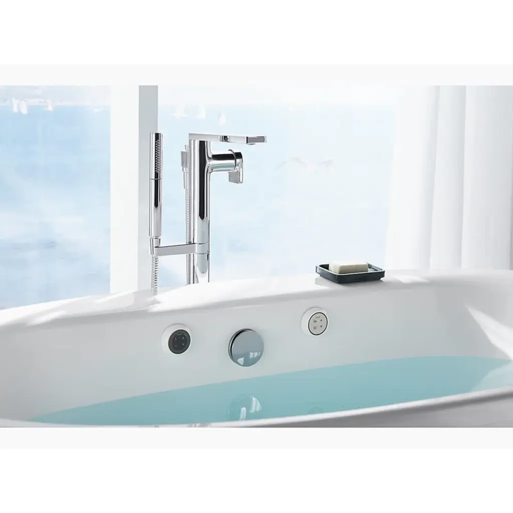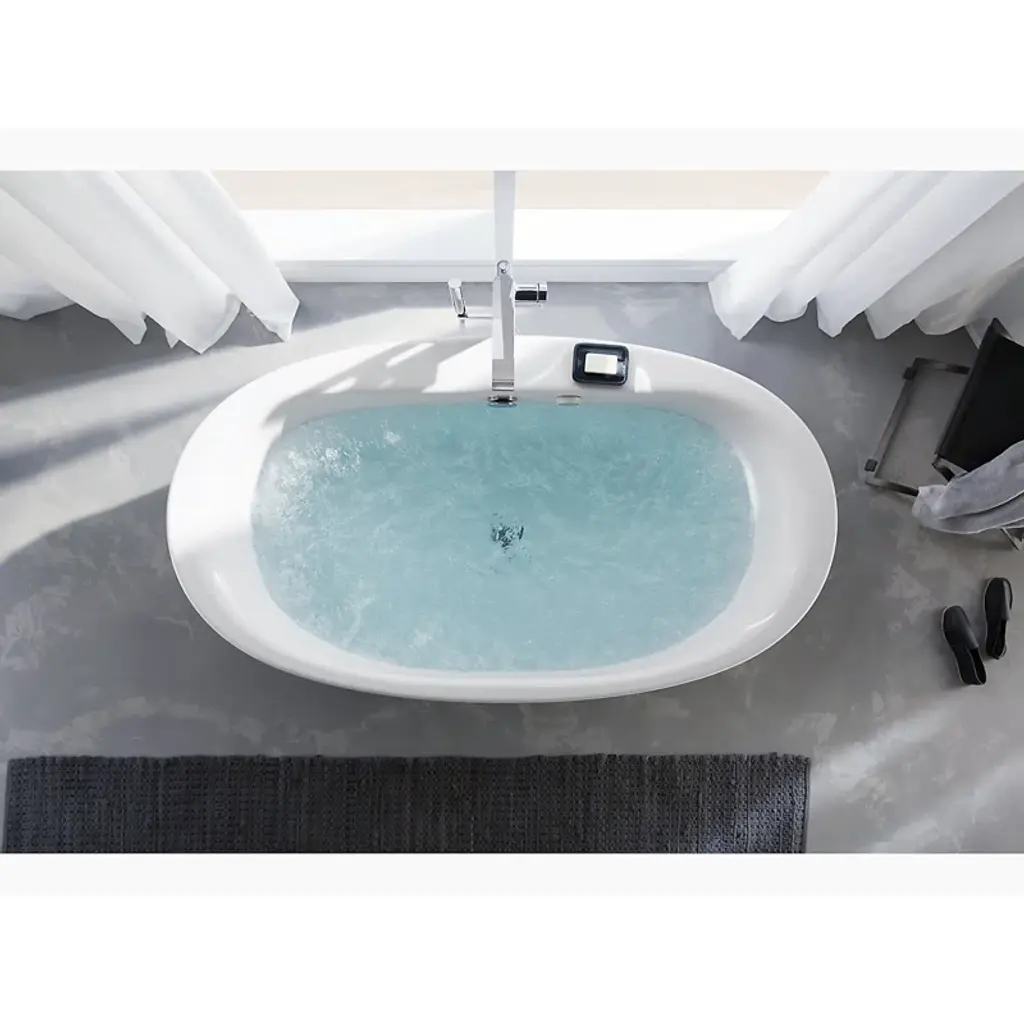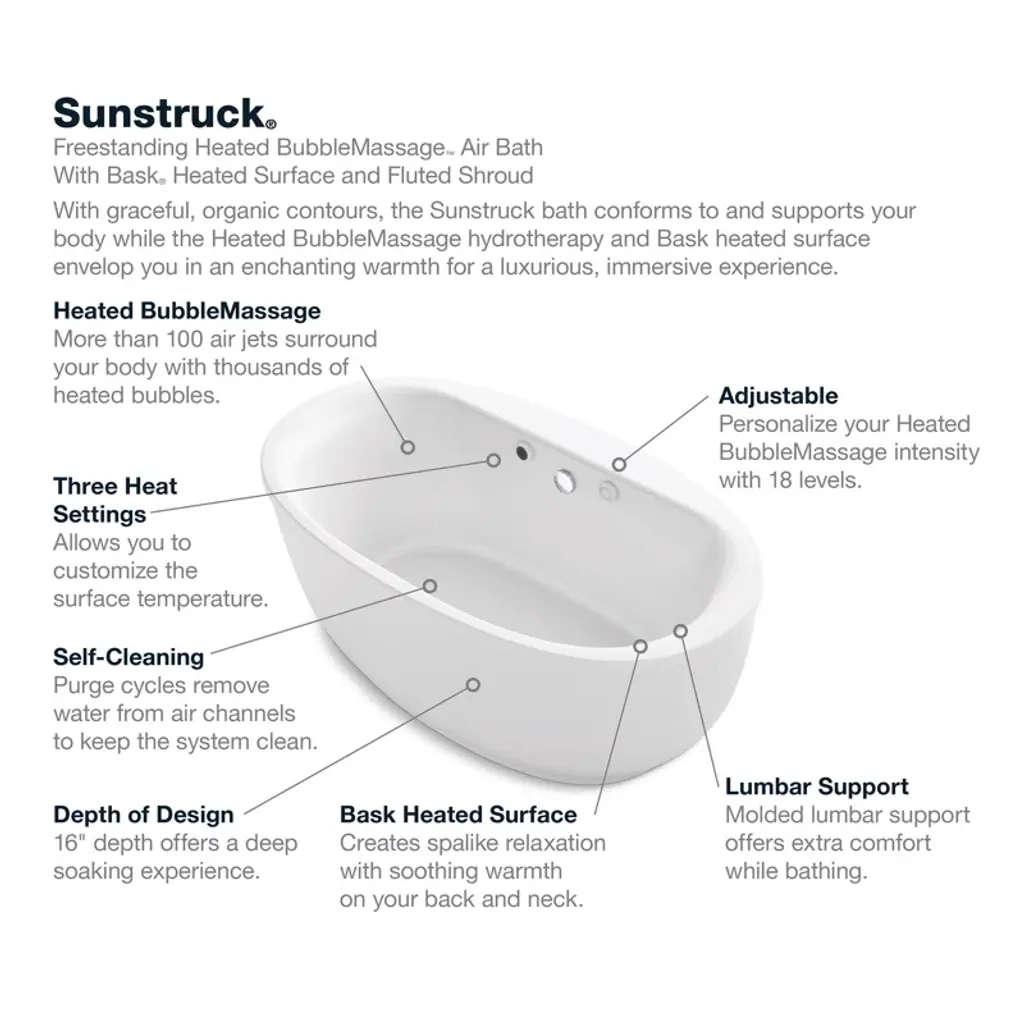 Completely surround your body in a soothing cushion of heated massaging bubbles in this Sunstruck® freestanding air bath. With air jets pushing humidified air through the water, this bath delivers a blissfully warm, invigorating full-body massage experience, while the heated surface warms your back, shoulders, and neck. The oval, ergonomic design supports your body for a deep, relaxing soak. With its gracefully shaped lines and fluted shroud, this versatile bath complements a wide range of bathroom styles and offers easy three-step installation.