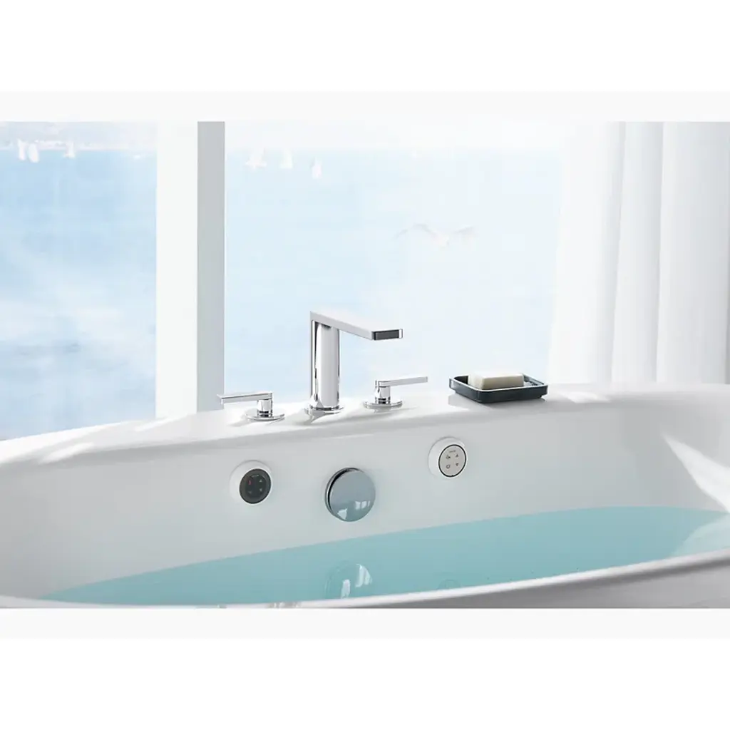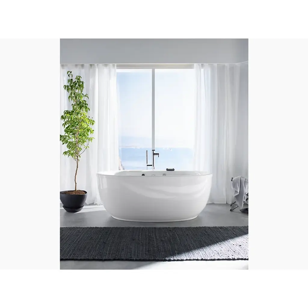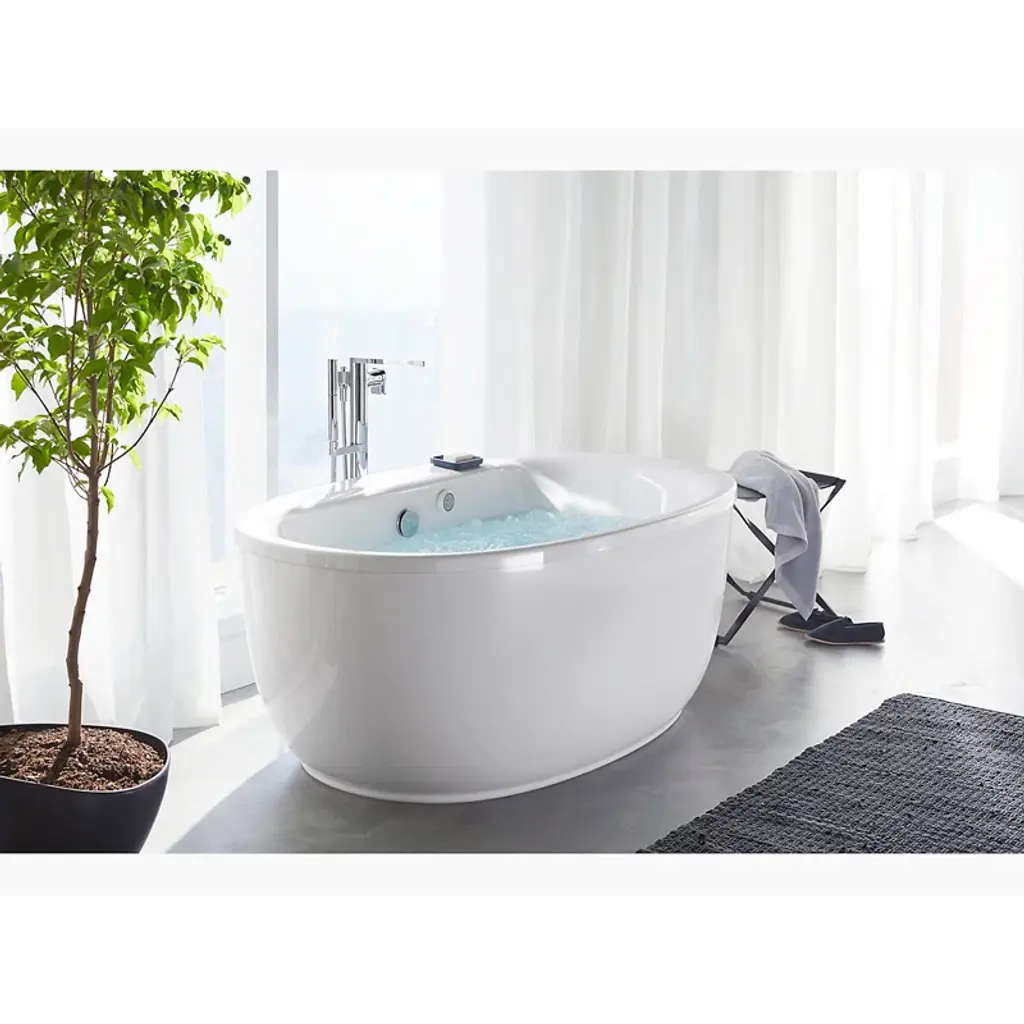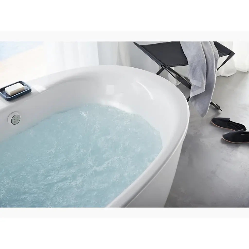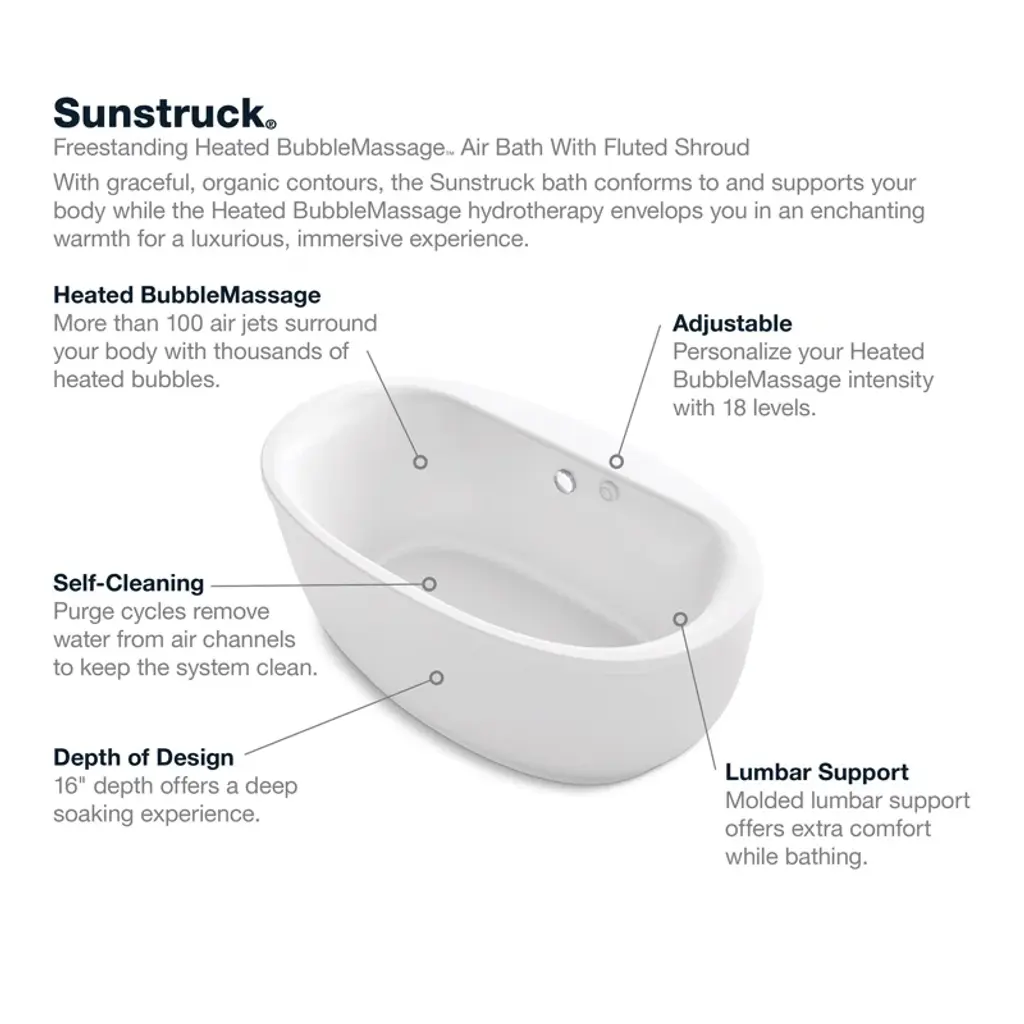 Completely surround your body in a soothing cushion of heated massaging bubbles in this Sunstruck® freestanding air bath. With air jets pushing humidified air through the water, this bath delivers a blissfully warm, invigorating full-body massage experience. The oval, ergonomic design supports your body for a deep, relaxing soak. With its gracefully shaped lines and fluted shroud, this versatile bath complements a wide range of bathroom styles and offers easy three-step installation.