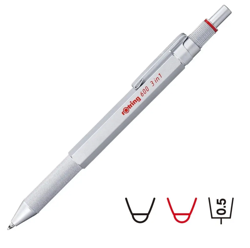 Supreme®/rOtring 600 3-in-1Multicolor pen and mechanical pencil. Includes black and red ballpoint inks with 0.5 mm mechanical pencil. Additional blue refill included.