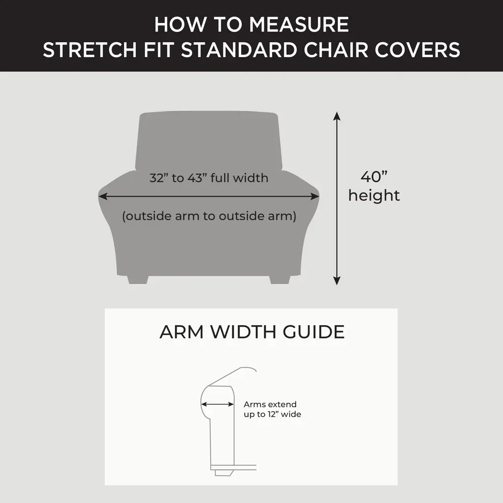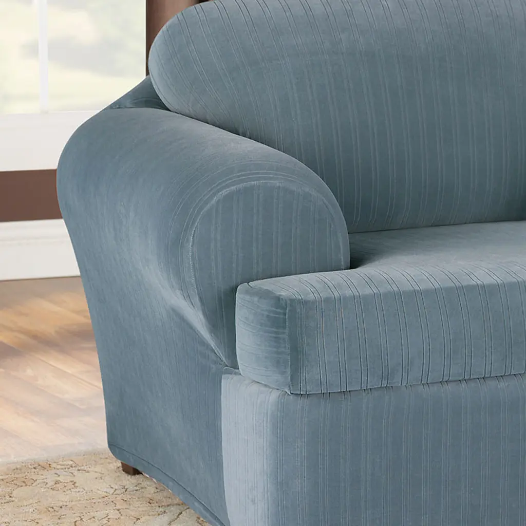 Sure Fit Home Decor Stretch Pinstripe T-Cushion Chair Two Piece Slipcover, Form Fit, Polyester/Spandex, Machine Washable. A solid pinstripe in our form fitting stretch material is a perfect decorating solution for hard to fit furniture. This two-piece stretch slipcover with separate zippered seat cushion provides a semi- custom look. Fits most Chairs 32"-43" when measured across furniture outside arm to arm. Made with 94% Polyester and 6% Spandex. Our patented two-piece form fit stretch includes slipcover with one zippered separate seat cushion and elastic hem. Machine wash separately in cold water on gentle cycle and tumble dry low. Do not use bleach. Do not iron.