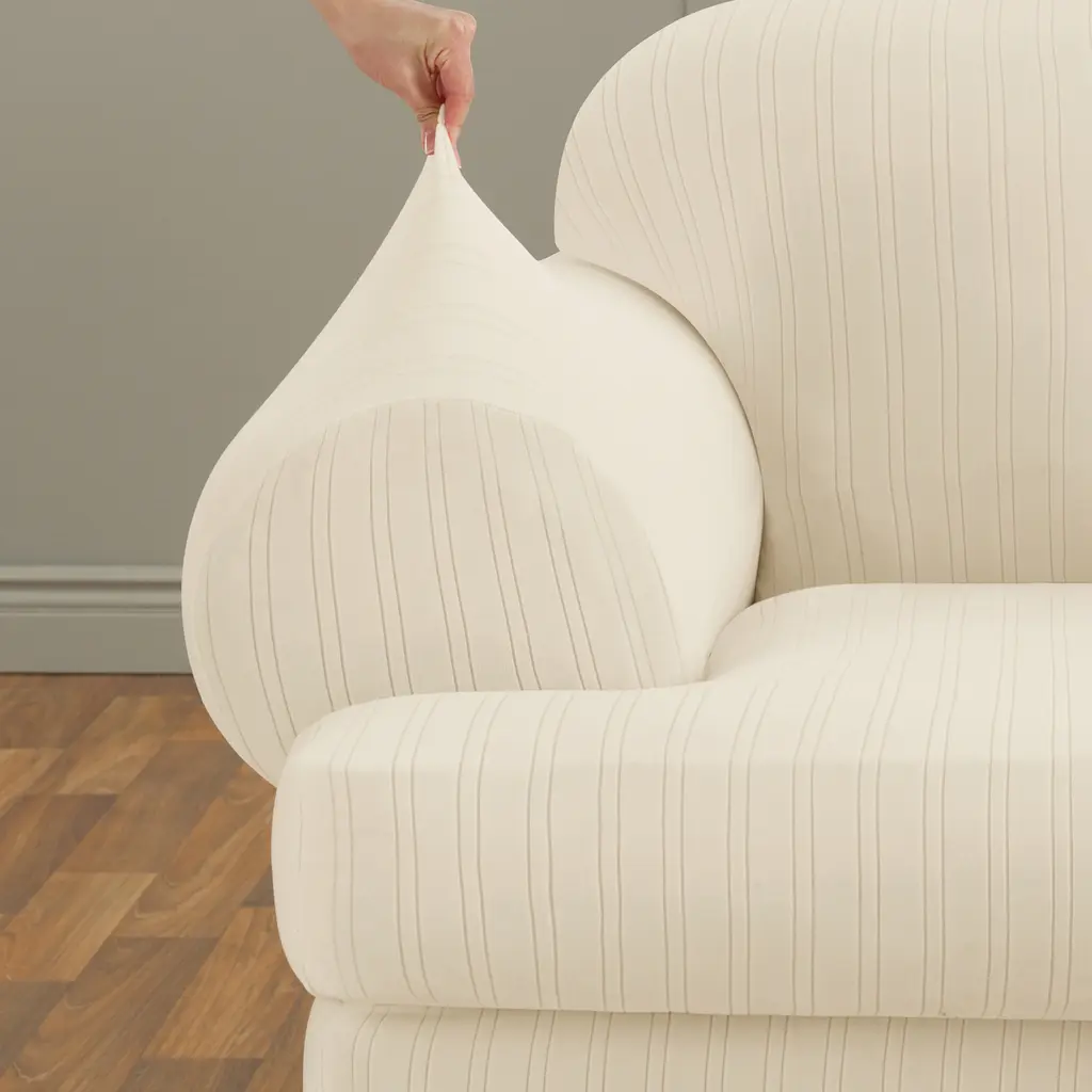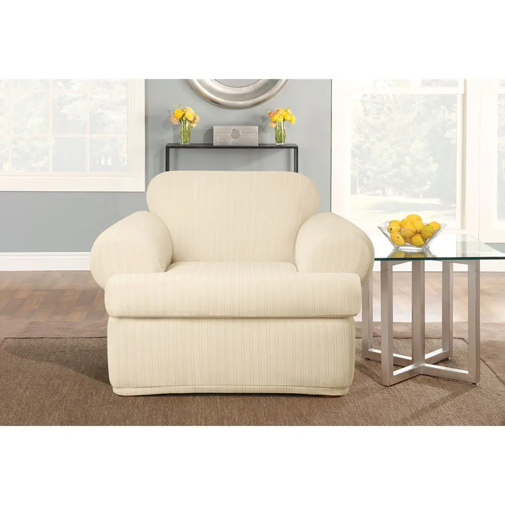 Sure Fit Home Decor Stretch Pinstripe T-Cushion Chair Two Piece Slipcover, Form Fit, Polyester/Spandex, Machine Washable. A solid pinstripe in our form fitting stretch material is a perfect decorating solution for hard to fit furniture. This two-piece stretch slipcover with separate zippered seat cushion provides a semi- custom look. Fits most Chairs 32"-43" when measured across furniture outside arm to arm. Made with 94% Polyester and 6% Spandex. Our patented two-piece form fit stretch includes slipcover with one zippered separate seat cushion and elastic hem. Machine wash separately in cold water on gentle cycle and tumble dry low. Do not use bleach. Do not iron.