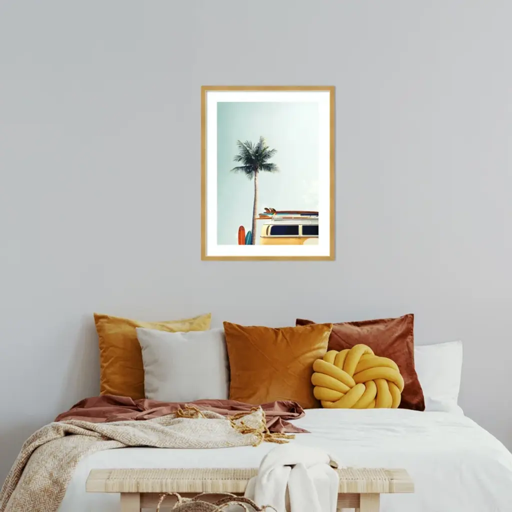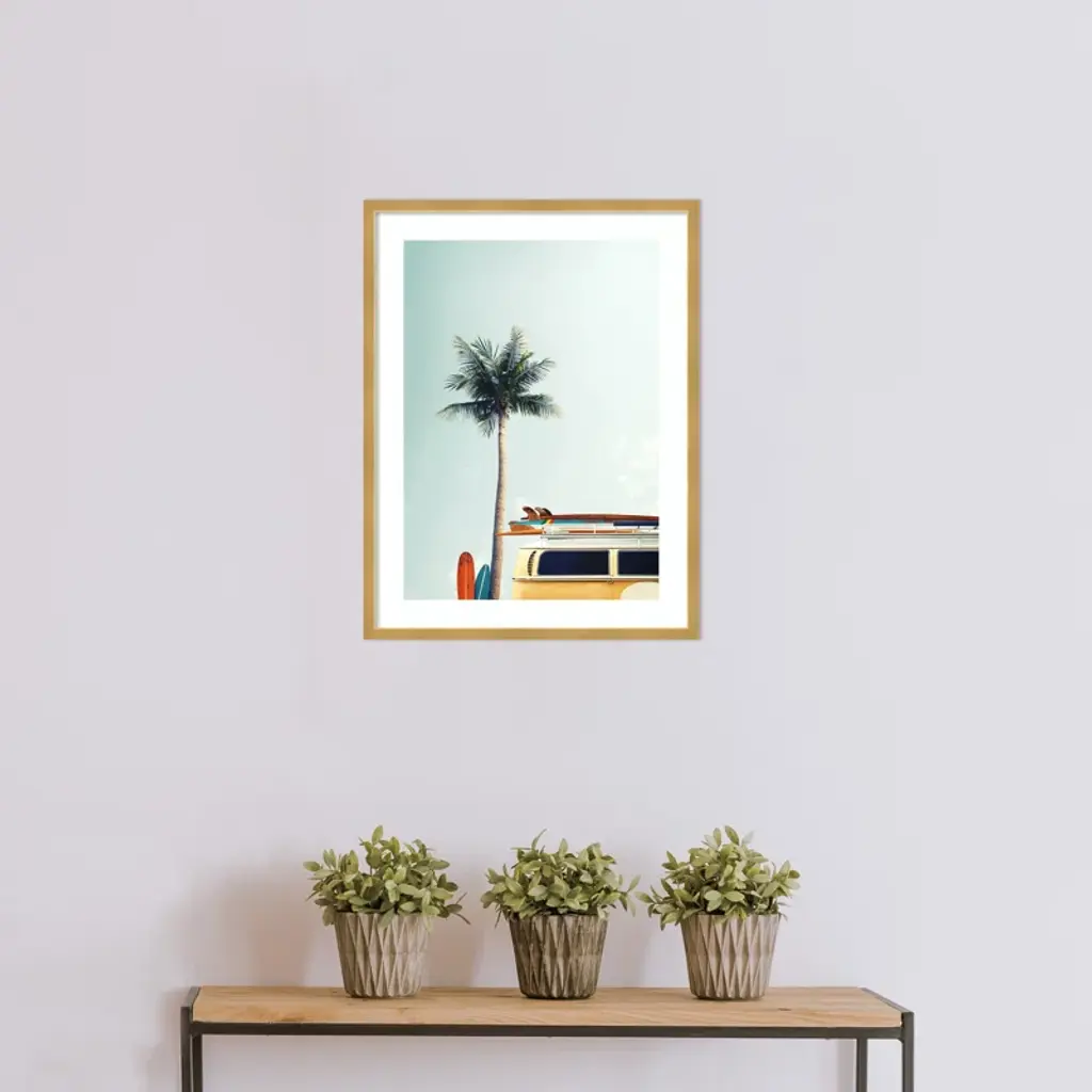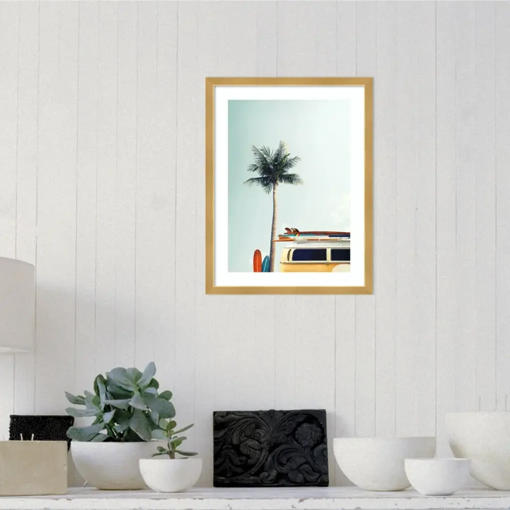 Keep a warm West Coast vibe around with this photo print. Printed in the USA, this piece from Design Fabrikken features a palm tree and yellow retro bus with a series of surfboards on its roof, both silhouetted against the pale blue sky. This piece is giclee-printed on paper using archival inks for an accurate reproduction. It arrives in a wood frame and is covered with shatterproof acrylic that helps protect the image from fading. A wall hanging wire is attached, and mounting hardware is included.