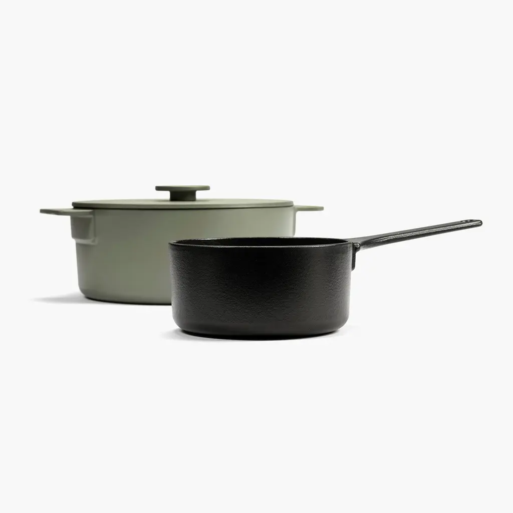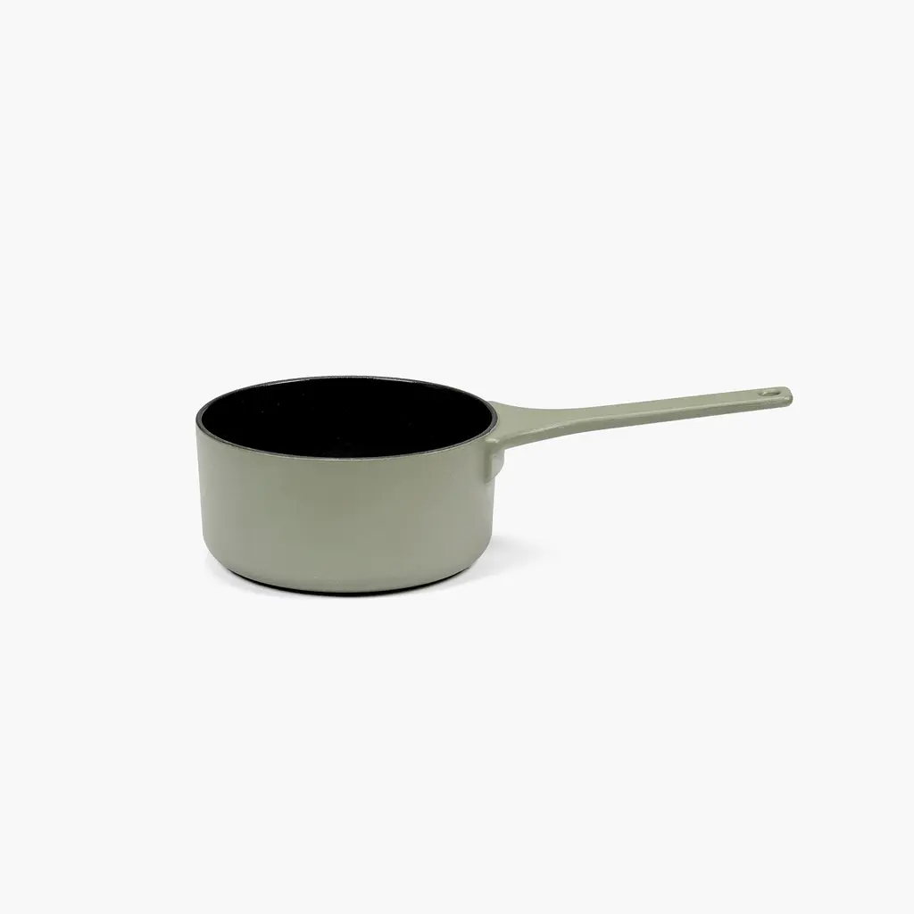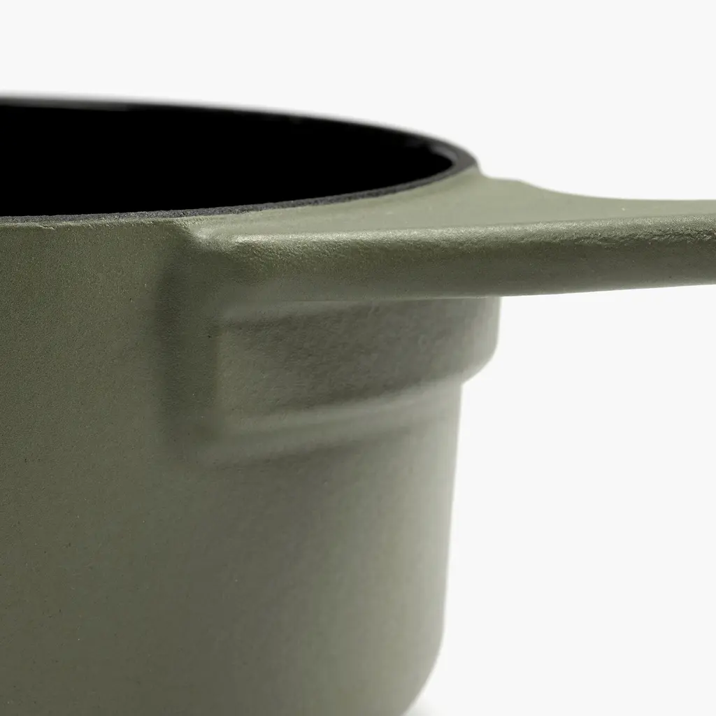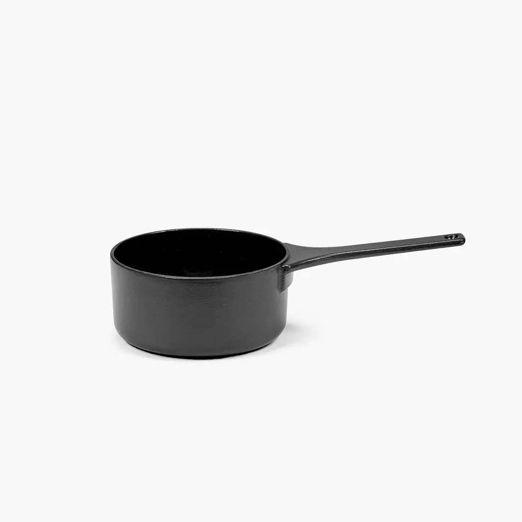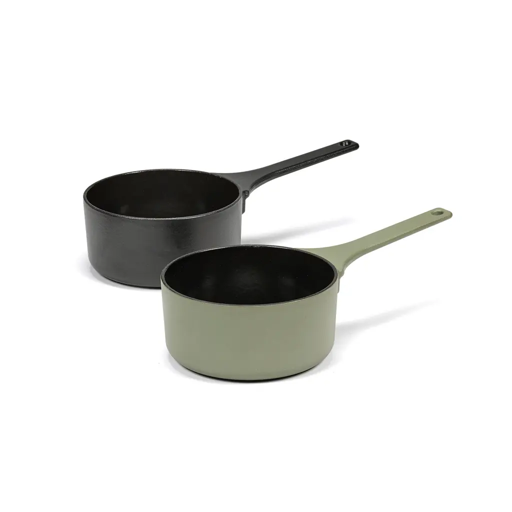 Whether you want to prepare a sauce for mash potatoes or to drench an apple crumble in delicious caramel, the Serax Surface Cast Iron Sauce Pan XS is the perfect choice. You can use it not only for sauces but also to boil or poach eggs, prepare quinoa, or heat a portion or two of soup. Like other Surface cookware, this sauce pan is made from durable and sturdy cast iron. The exterior boasts either a Black or a Camo Green finish, with the interior featuring a non-stick glazed surface that is easy to clean. The long handle is comfortable to hold and also features an opening to hang the pan on a hook in the kitchen. Discover the other matching Surface cookware from the collection to create a complete set for your inner chef.