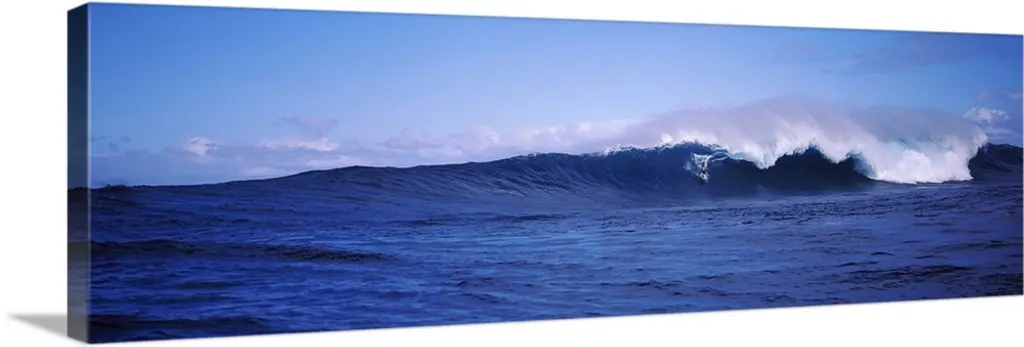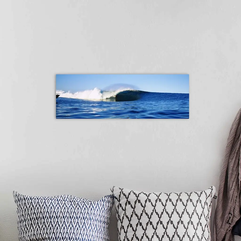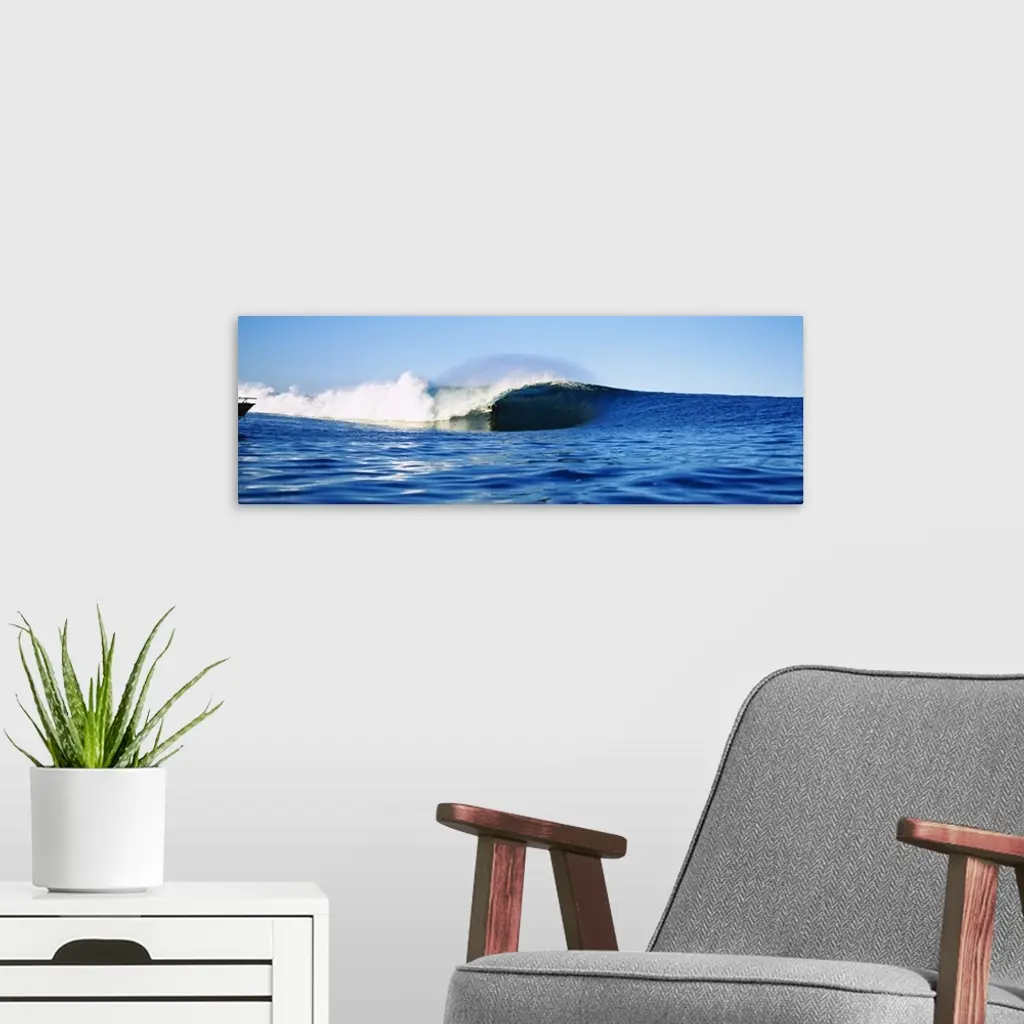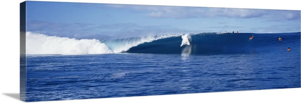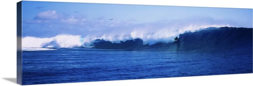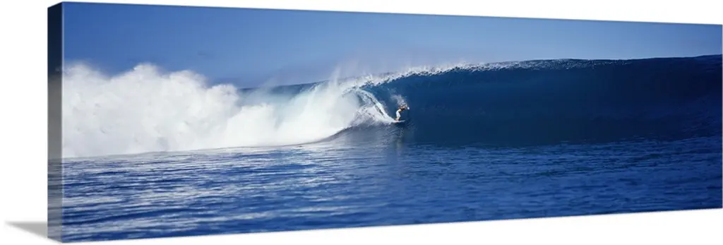 Large, horizontal photograph of a distant surfer riding a large wave, in the blue waters of Tahiti, French Polynesia.