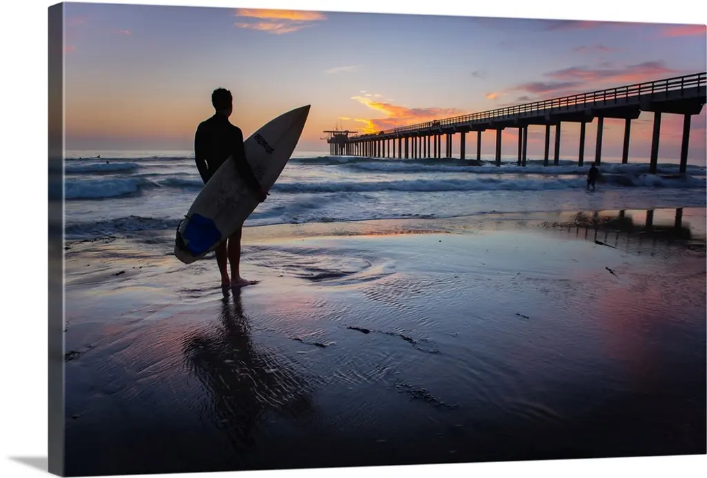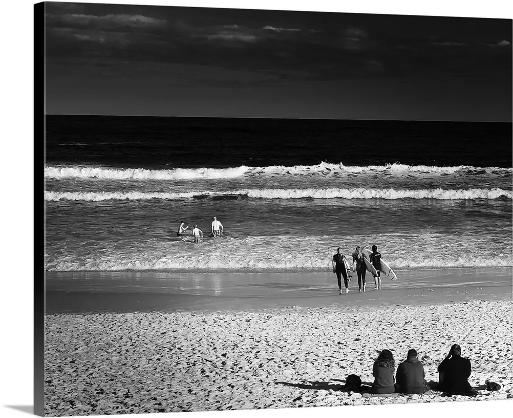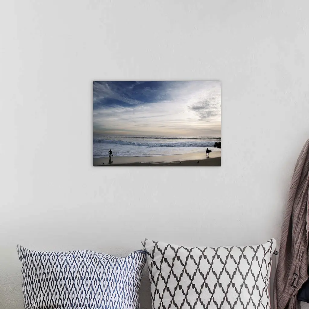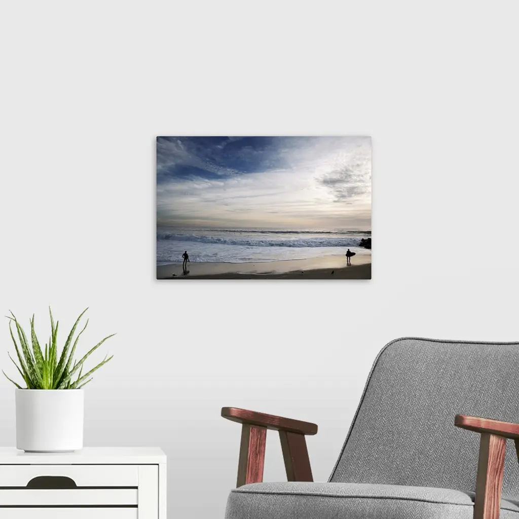 Huge photograph displays a couple individuals with surfboards standing on the edge of the ocean and watching the waves crash into shore.