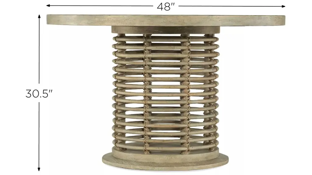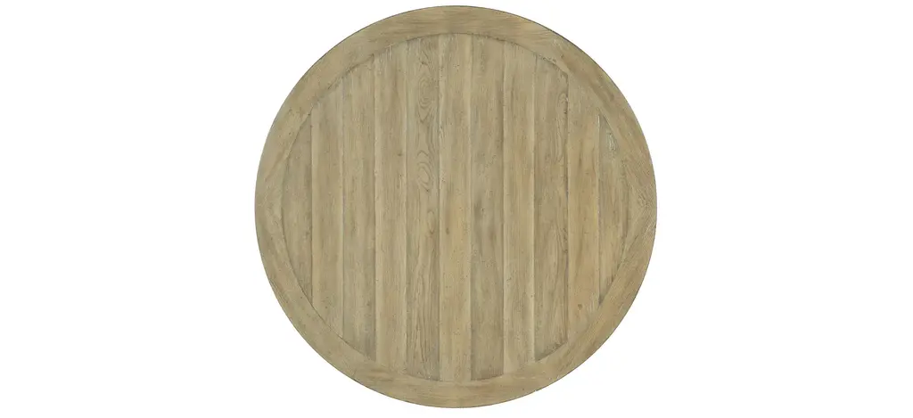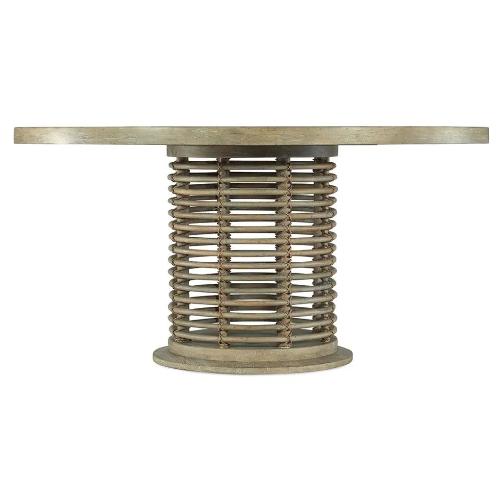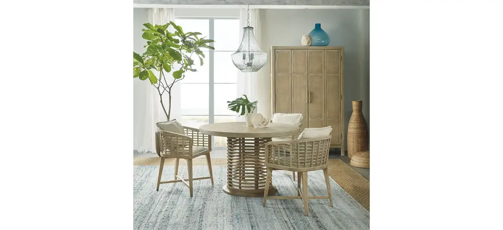 Linger and relax around this 48-inch round rattan Surfrider dining table inspired by the laid-back California coast. A marvel of craftsmanship, the Surfrider table combines natural materials of cane, rope and Pecan Veneers with a solid wood edge top and hand-tied jute rope on the table base. Epitomizing the lifestyle of a casual, beach-town community, the Surfrider dining table includes the base and top and features the light natural Driftwood finish with distressing including sandblasting and bleaching.