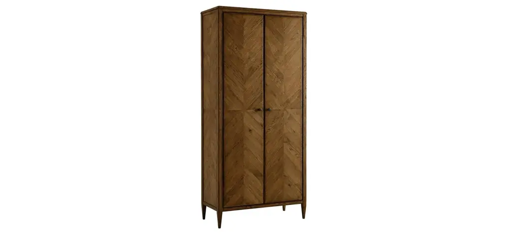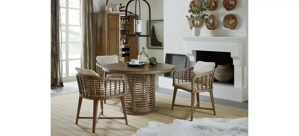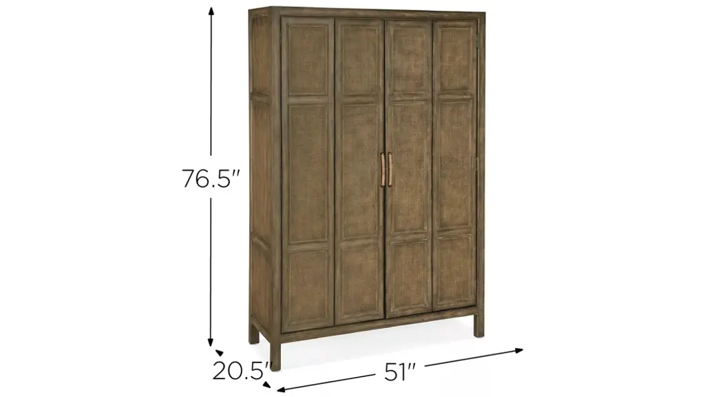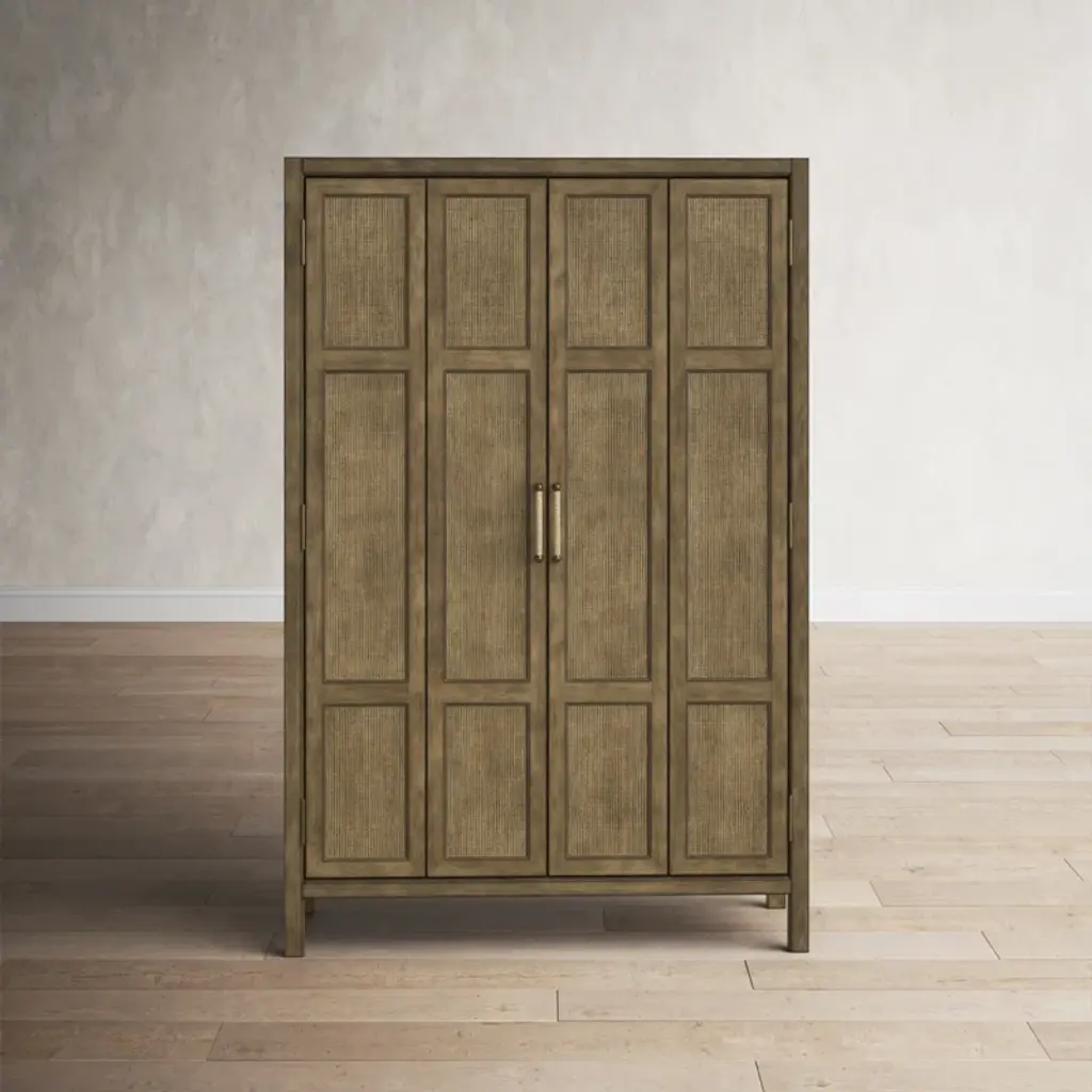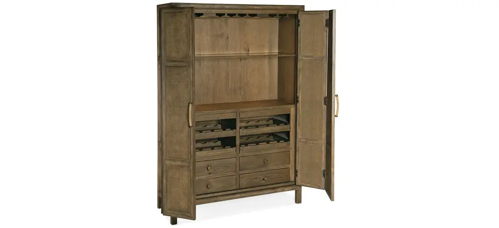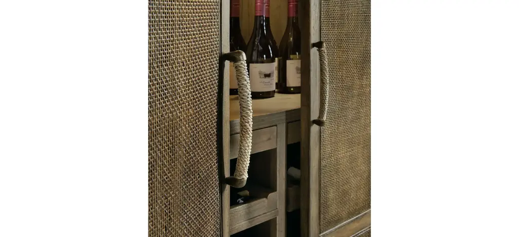 Escape the stress and extend hospitality to others with the resort-inspired Surfrider Bar Cabinet, featuring two bi-fold rattan doors, four drawers with self-closing drawer guides, two pull-out work surfaces, four pull-out wine shelves and eight stemware racks. Crafted of Pecan Veneers, Rattan and glass, the bar cabinet is finished in Cliffside, a rich, dynamic brown finish with light burnishing on the edges. Lights are activated by a three-intensity touch switch.