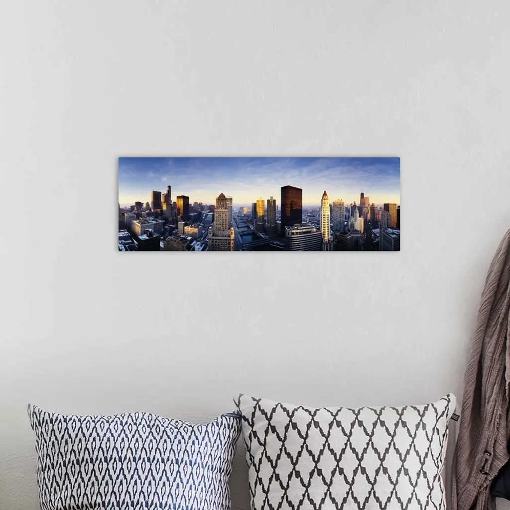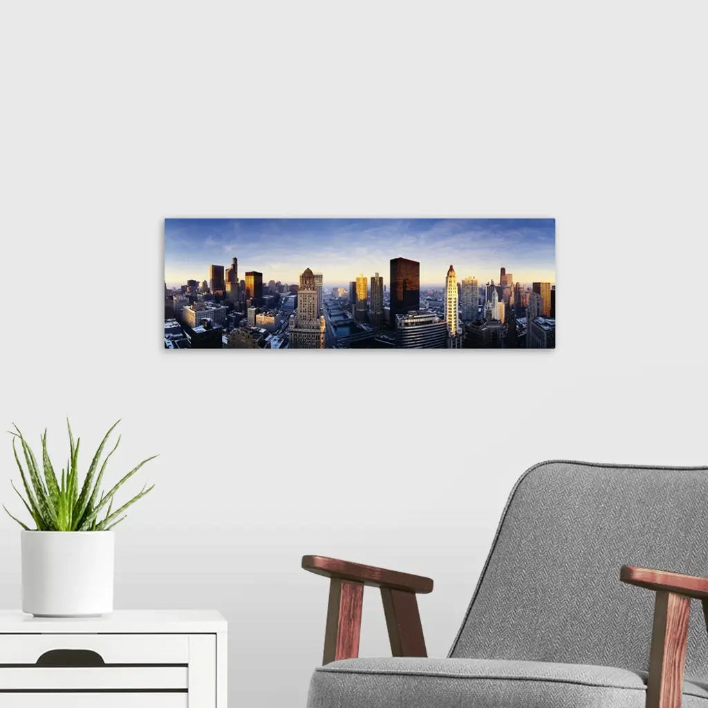 Expansive panoramic photograph of the early morning sunrise over Chicago, Illinois (IL) landscape. The Chicago river, large and small buildings, and skyscrapers are visible as the sun begins to break and the sun's rays begin to touch the structures.