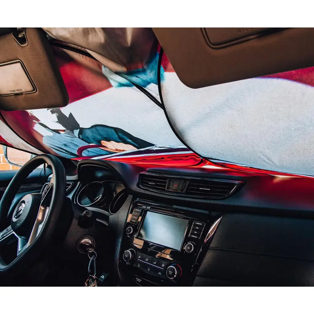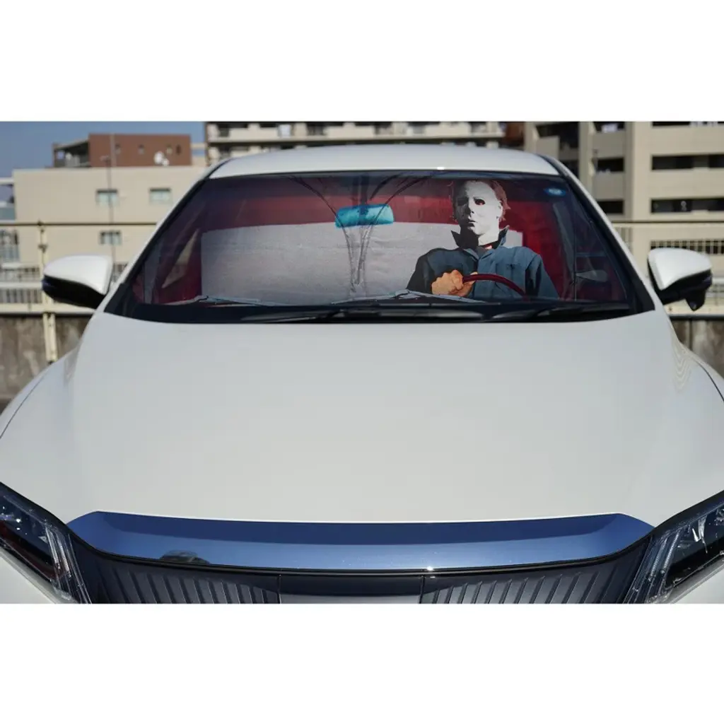 Ever opened your door to a blast of hot air in your face? Here’s the solution! This Halloween sunshade protects, cools, blocks out UV rays and keeps your interior from cracking and fading. Sunshade makes it look like masked killer Michael Myers is driving your car - with Tiffany along for the ride! A Toynk exclusive, our visor measures 64 x 32 inches, fitting most cars, trucks, and vans. Foldable and easy to store!