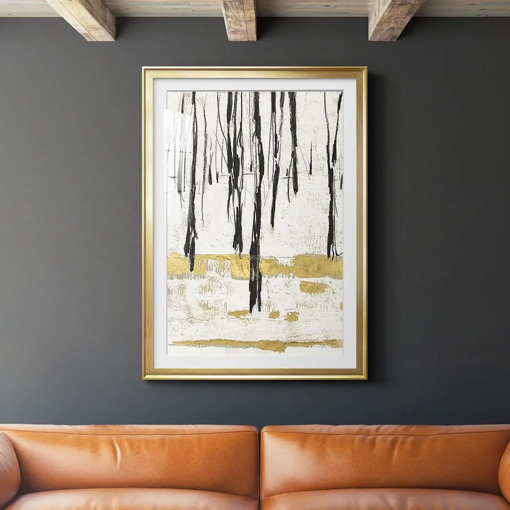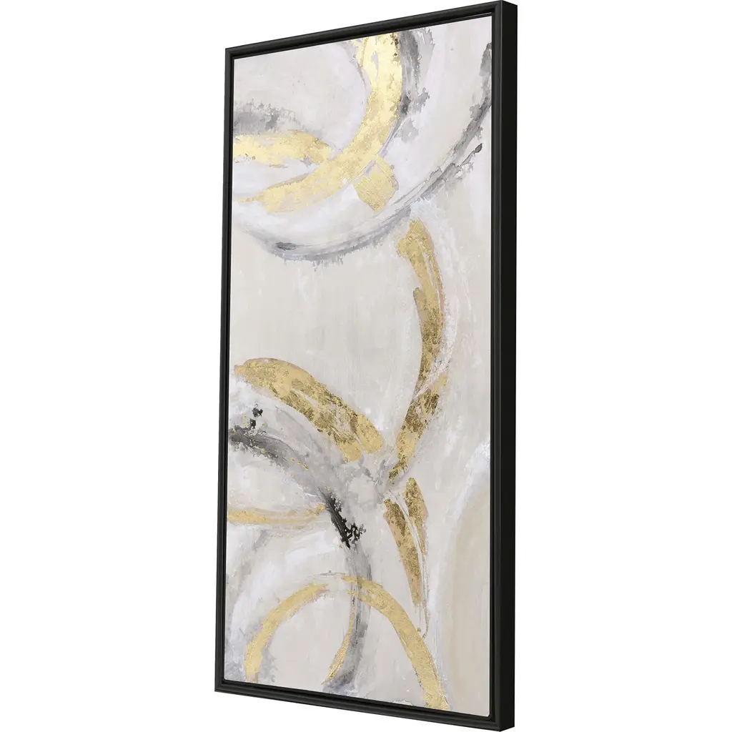 Exclusive hand painted canvas with gold leaf. Hand stretched and mounted in a satin black wood floater frame.