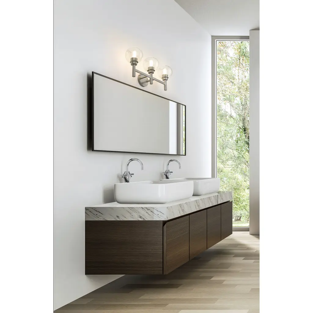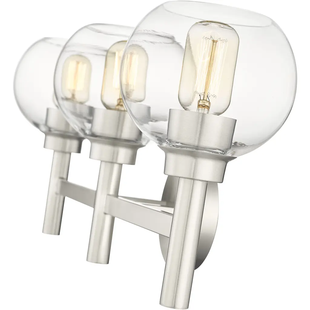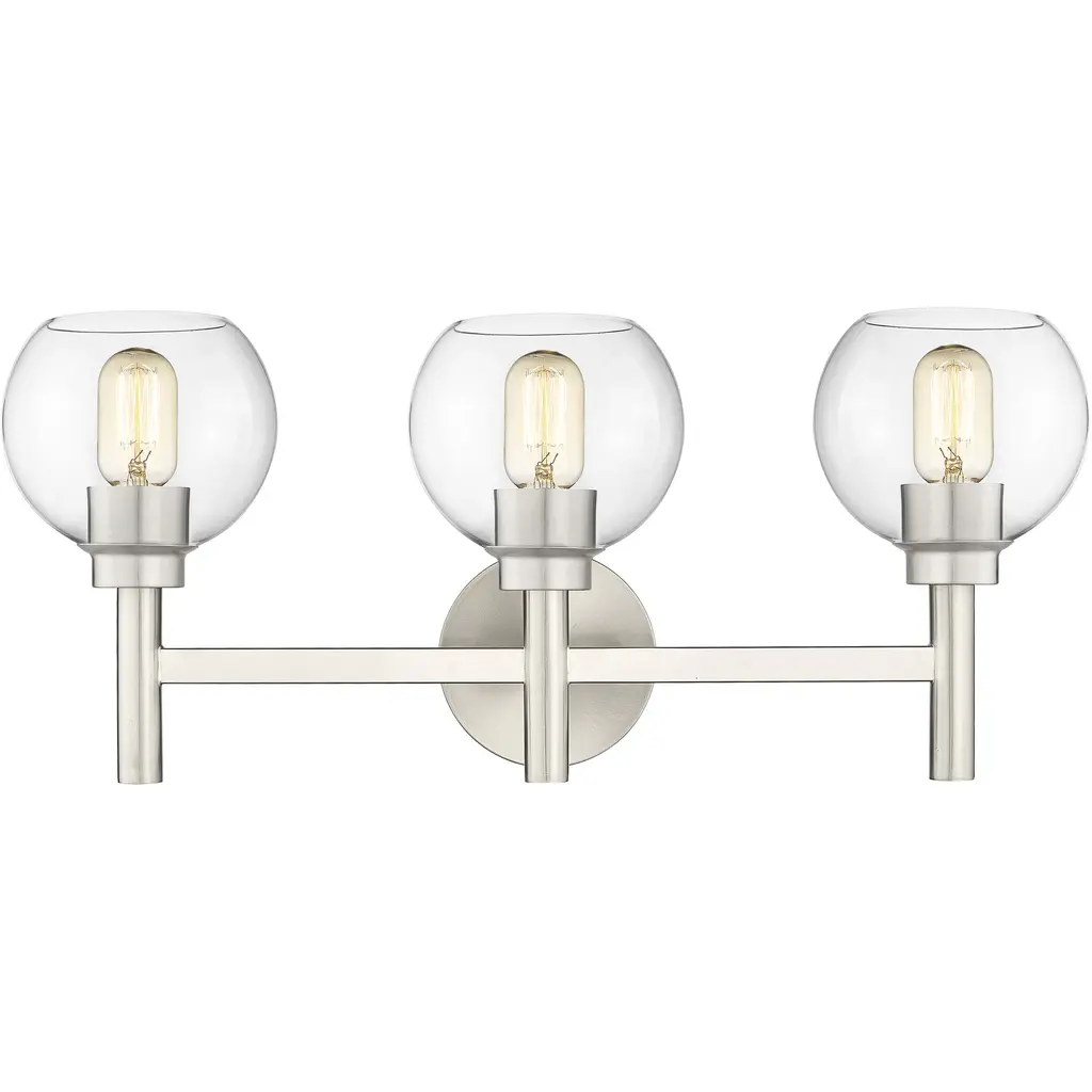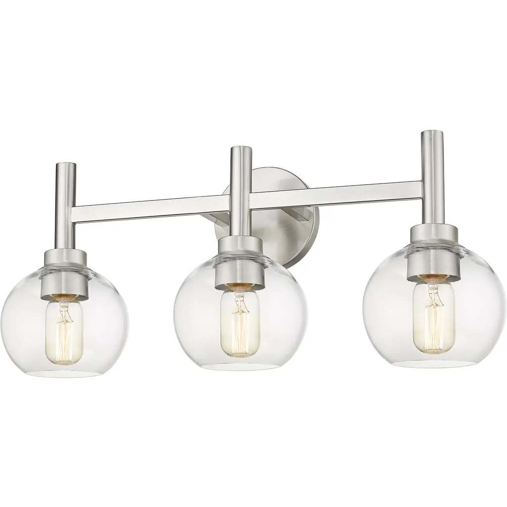 The precision of a perfect circle defines the modern ambiance of a contemporary three-light vanity wall light. From the Sutton collection, the sconce boasts a trio of torch-style lights, complete with brushed nickel finish framing and a round wall plate. Three open-edged globe shades are precisely crafted in clear glass, delivering maximum illumination to your vanity and bathroom space.